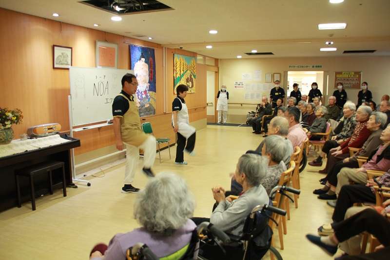 こんにちは、グループホーム みんなの家 西東京です。11月8日は、立冬でしたね!朝晩かなり寒くなってきました。今ここの施設、外向とエアコン工事が入っていて、共有部や各居室のエアコンが新しくなっております。居室のエアコンは、交換が終わるとすぐに可動するのですが、共有部の大きなエアコンは、屋上の室外機につなげるため全部のエアコンがとりつかないと動かないので、朝晩皆様、ちょっと厚着になってきました。もう少しで終わりそうですそれまで少しの我慢です。さて、本日は、月の第2火曜日、NŌAエクササイズの日です。1階のエントランスに、各施設のご利用者様(本日は、42名の参加)が集まり、無理なく少しづつ体をほぐしながら指先から全体に血流を良くする運動を約50分皆様いつもニコニコしながら、時に大きな声で笑い、おなかから声を出し終わるころには皆様のホッペがリンゴのように赤くなりました。12月は10日です。今年最後のNŌAエクササイズになります。どなたでも参加できます。無料です。すこや家 西東京に12月10日 14:00~です。どうぞご参加ください。お待ちしております。
