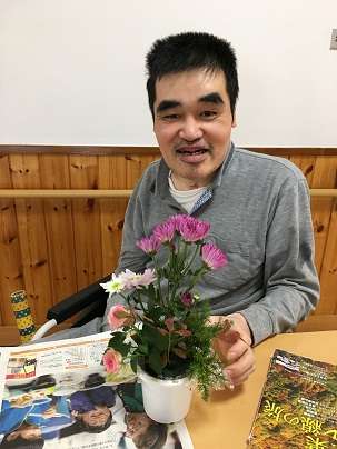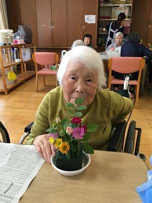 先日ご利用者様たちが本館にお集まりになり、久しぶりのフラワーアレンジメントを行いました。