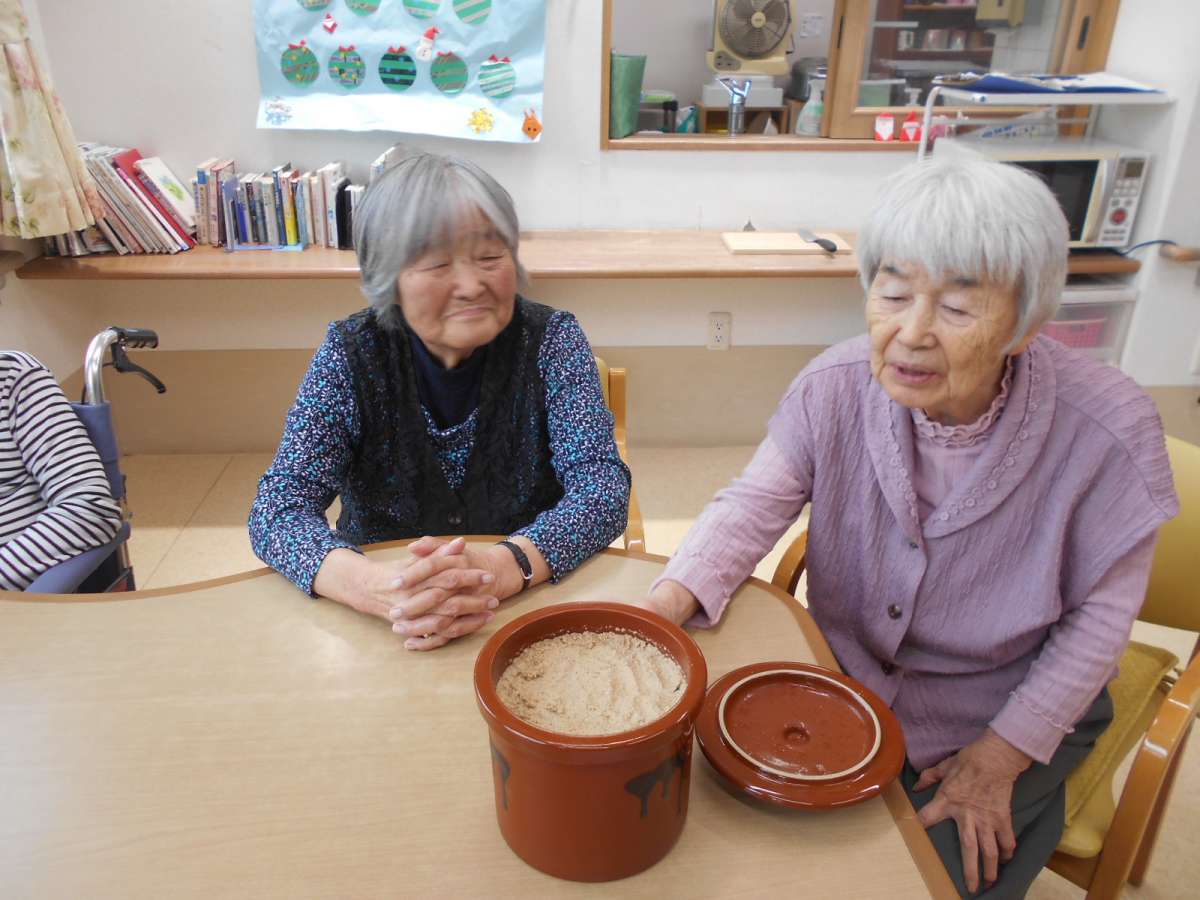| こんにちは、グループホーム みんなの家・春日部花積です。 今日はとても楽しいおやつ!!の紹介です。 Y職員の家宝である「ぬか床」がホームにお目見え。 皆さん ぬか床を前に びっくりと同時に すぐにかき混ぜ態勢です! これは毎日、かき混ぜるのが大事なのよ~と 主婦の鏡の様な皆様でした |