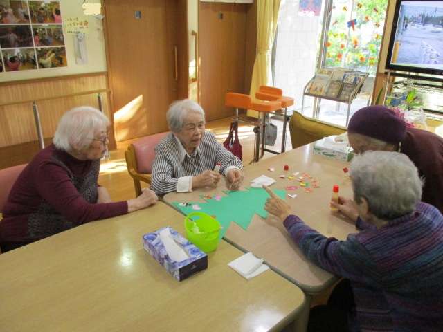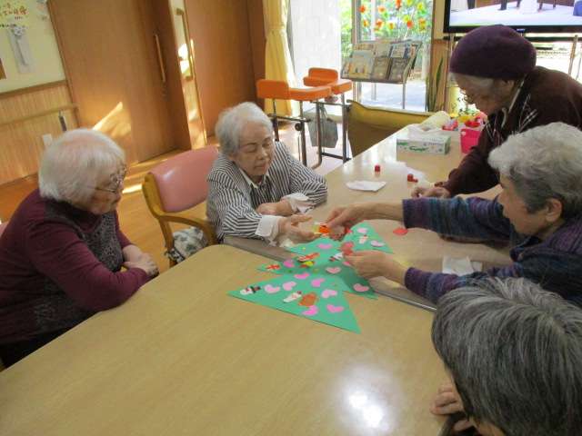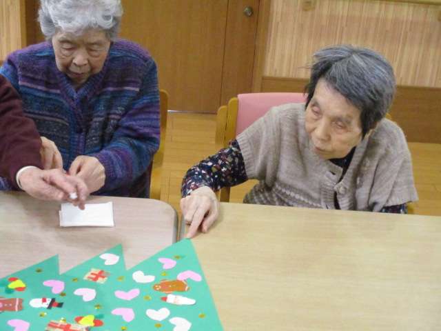 「クリスマスの飾りつけをしましょう!」の一言で皆様とスタッフであっという間に仕上がりました(*^^)v