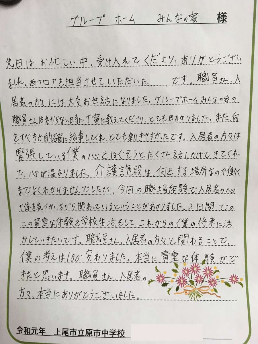こちらこそ、上尾市に数ある介護施設の中から社会体験の場としてグループホーム みんなの家上尾瓦葺をお選びいただき光栄です!