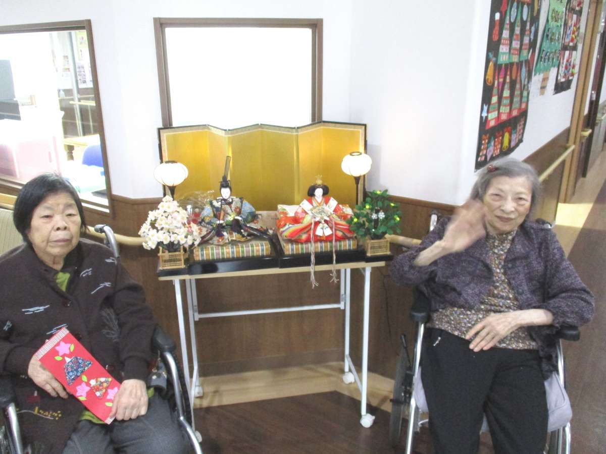 先日お知らせした”お雛様の短冊”を今日は、2階の皆さんに作って頂きました。出来上がった短冊を持って、お雛様の前で記念撮影です。
