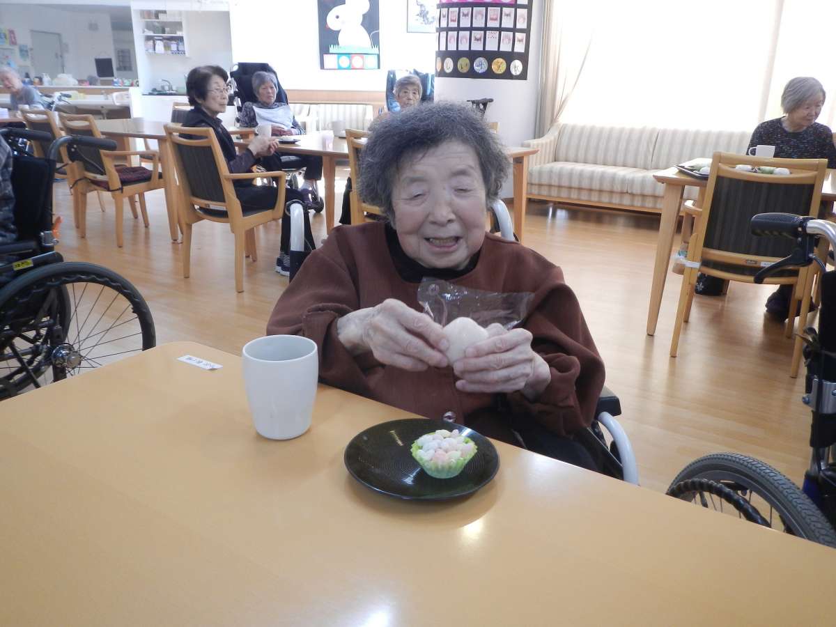 介護付有料老人ホームみんなの家・北本中丸では、「とらや」の金粉が乗ったおまんじゅうとひなあられをご用意して、ひなまつりを行ないました。