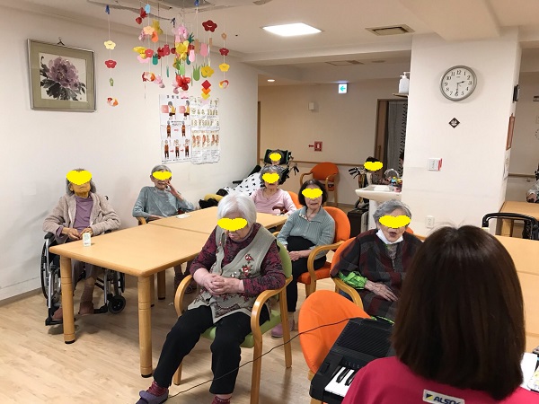 外部からの音楽療法を休止しているので、職員がキーボードを弾き皆さんで合唱しました。