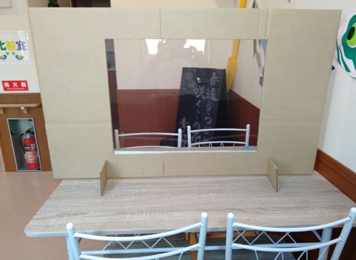 面談中のコロナの飛沫感染防止にと、せせらぎのD・I・Y(=自身でやる)大臣こと、看護師の丸山さんがテーブル用の間仕切り(飛沫飛散防止シールド)を考案・制作して下さいました!!!
