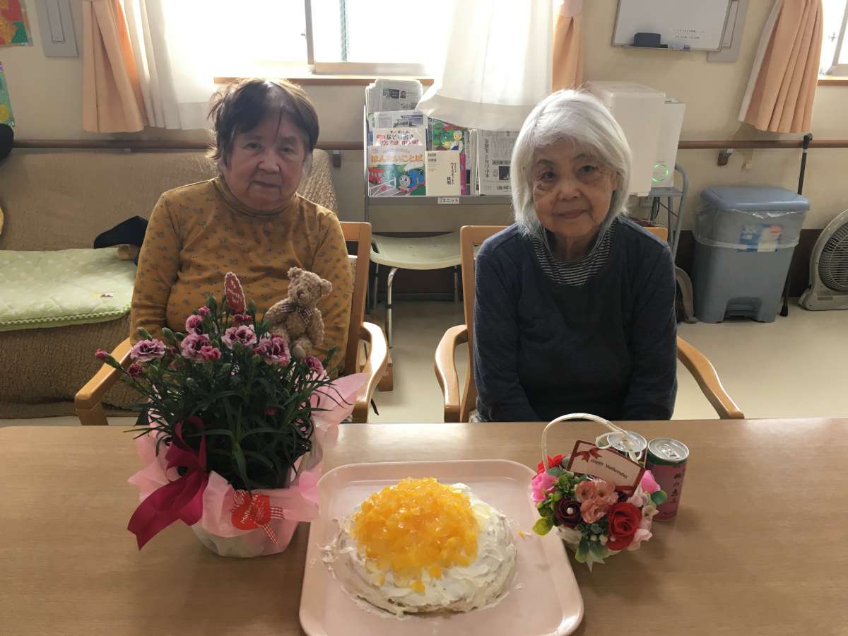 お花とケーキを前に