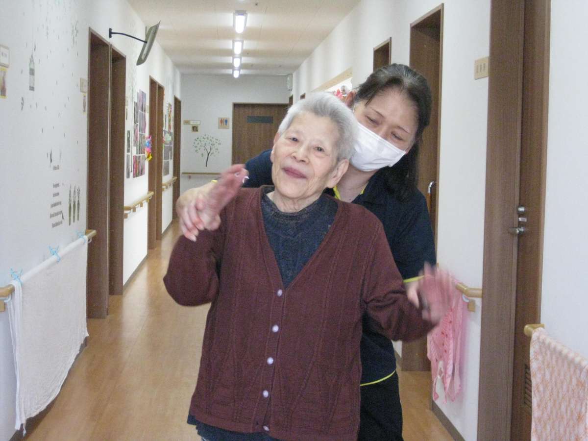 自粛生活に入り2か月、ストレスが溜まりイライラ気味が増えてきました・・・ GHあきがせ室内で介護職員と共に車椅子にて散歩をしました。手を振って下さり気分転換できたかな~(笑)