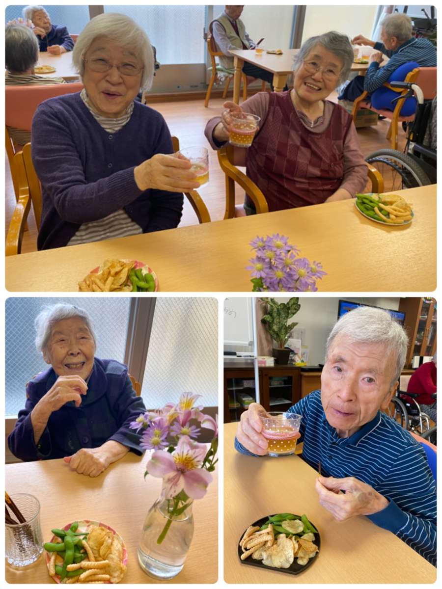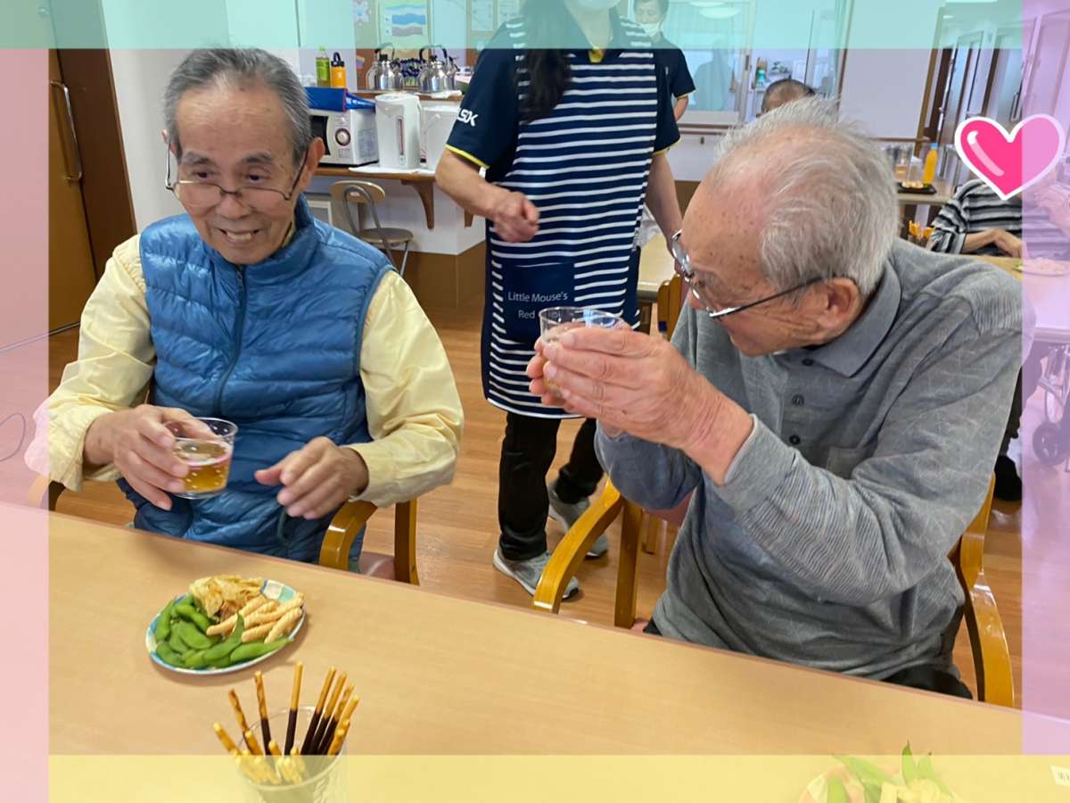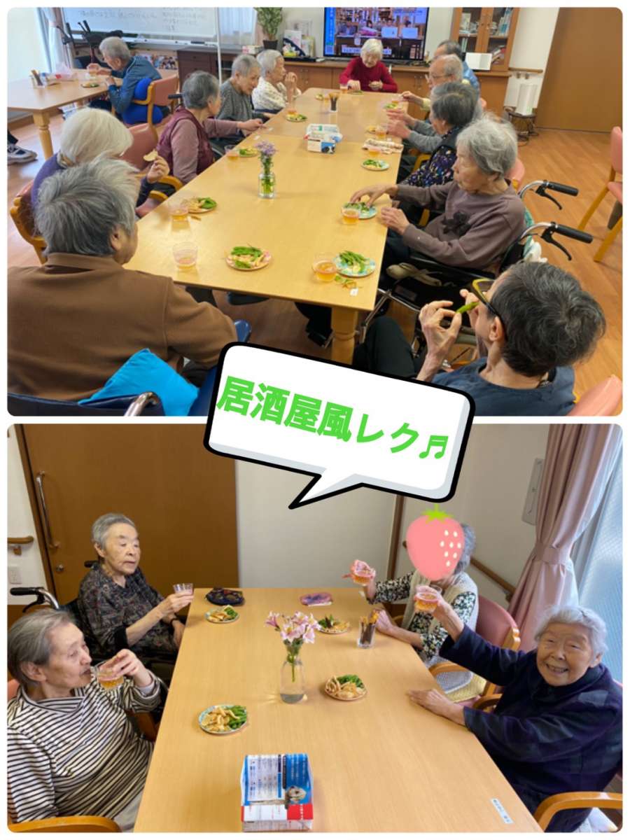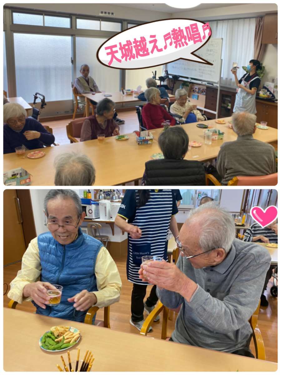 こんにちは。みんなの家・大宮内野本郷のコダマです(^。^) 花の丘公園そば。さいたま市西区。 宮原駅西口よりバス6分&徒歩4分のところにある施設です。 今日の午後は、入居者様に大好評な♡『居酒屋(風)レク』を行いました(๑˃̵ᴗ˂̵) 新型コロナウィルス対策で、一階と二階と別々での開催となりましたが(涙) ノンアルコールビールに、枝豆やポッキーなどなど、皆様笑顔で召し上がっていました♡ 『職員さん、なんか芸やって〜』とむちゃぶりなご要望に(笑) 剣道の先生をやっていた男性Hスタッフが、お手前を披露〜☆☆☆『格好いいー!』と拍手喝采(^。^) 『はーい、石川さゆりを歌いま〜す』と愉快なナースが熱唱♬←こぶしもきいていて素晴らしい歌声でした!! 入居者様と間隔をとり、マスクのまま歌いましたので、ご安心を♡ 今日も笑顔が絶えない二階フロアのご様子でした♬