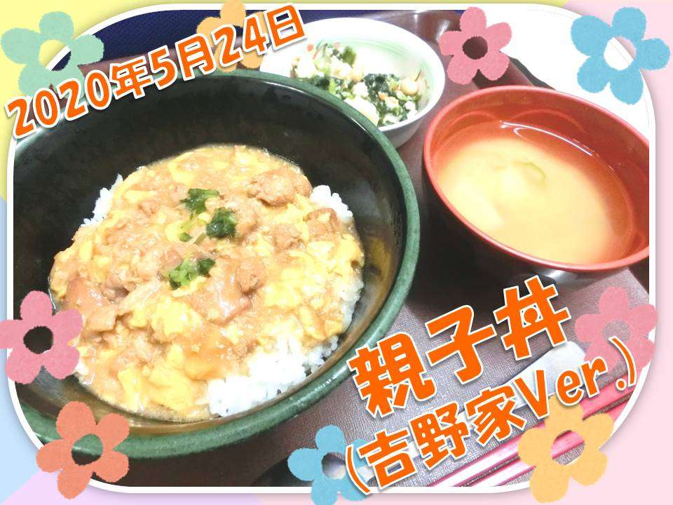 昼食は「吉野家特製親子丼」「青菜と大豆の白和え」「味噌汁(里芋、オクラ)」