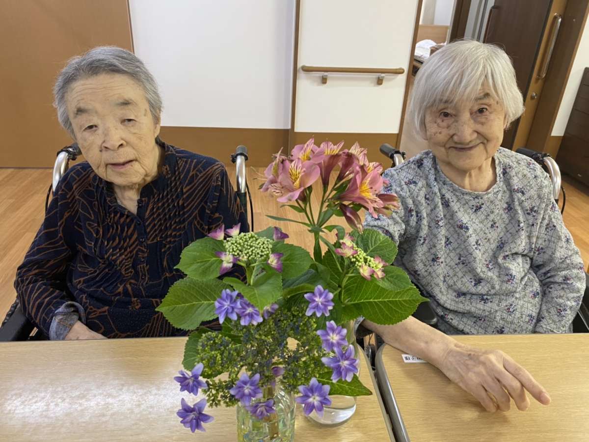 こんにちは。みんなの家・大宮内野本郷のコダマです(^。^) 花の丘公園そば。さいたま市西区。 宮原駅西口よりバス6分&徒歩4分のところにある施設です。 今日は湿度が低く、気持ちの良いお天気でしたね(^。^) お花が大好きな女性入居者様☆スタッフと一緒にご近所のご自宅にお散歩に行かれた際に♬バッタリお友達にお会いし、お花を頂いた〜♡との事♬ 早速花瓶にいけてテーブルに飾らせて頂きました♬内野本郷の畑に咲いている『紫陽花』と一緒に♡ 『このお花は名前なんていうのかしら?』と尋ねられた入居者様と一緒に、早速ネット検索(笑) 『アルストロメリア』といって、花言葉は』未来への憧れ・エキゾチック・献身的な愛』だそうです(^。^) お花パワーに、今日も笑顔が絶えない二階フロアのご様子でした♡