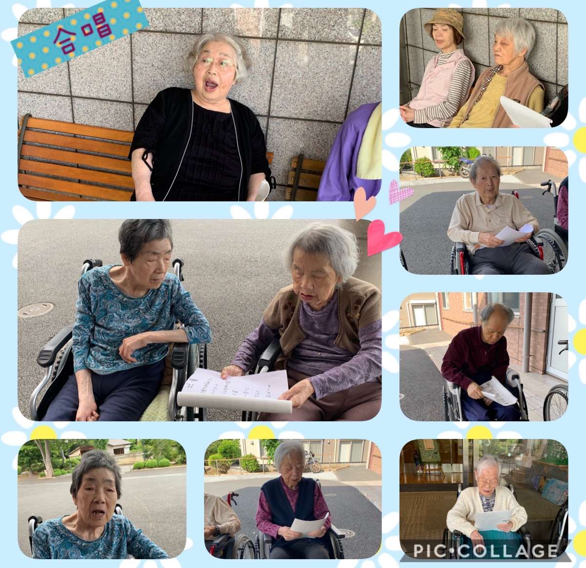 ここ数日天気のいい日が続いたので、外気浴も兼ねて青空の下皆さんと歌を唄いました。