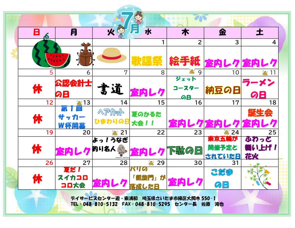 6月ももうすぐ中旬、ということで来月のレクリエーションカレンダーが出来上がりました☆