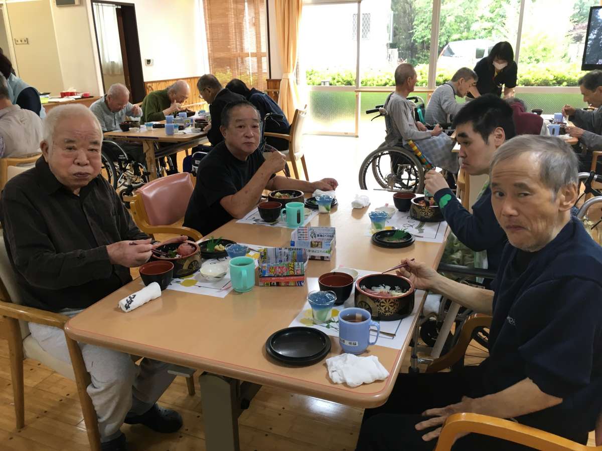 6月19日(金)父の日のイベントを行いました。男性のご入居さまに日頃の感謝の気持ちを込めてお昼ご飯に、特上天丼 海鮮丼 うな重などを召し上がっていただきました。