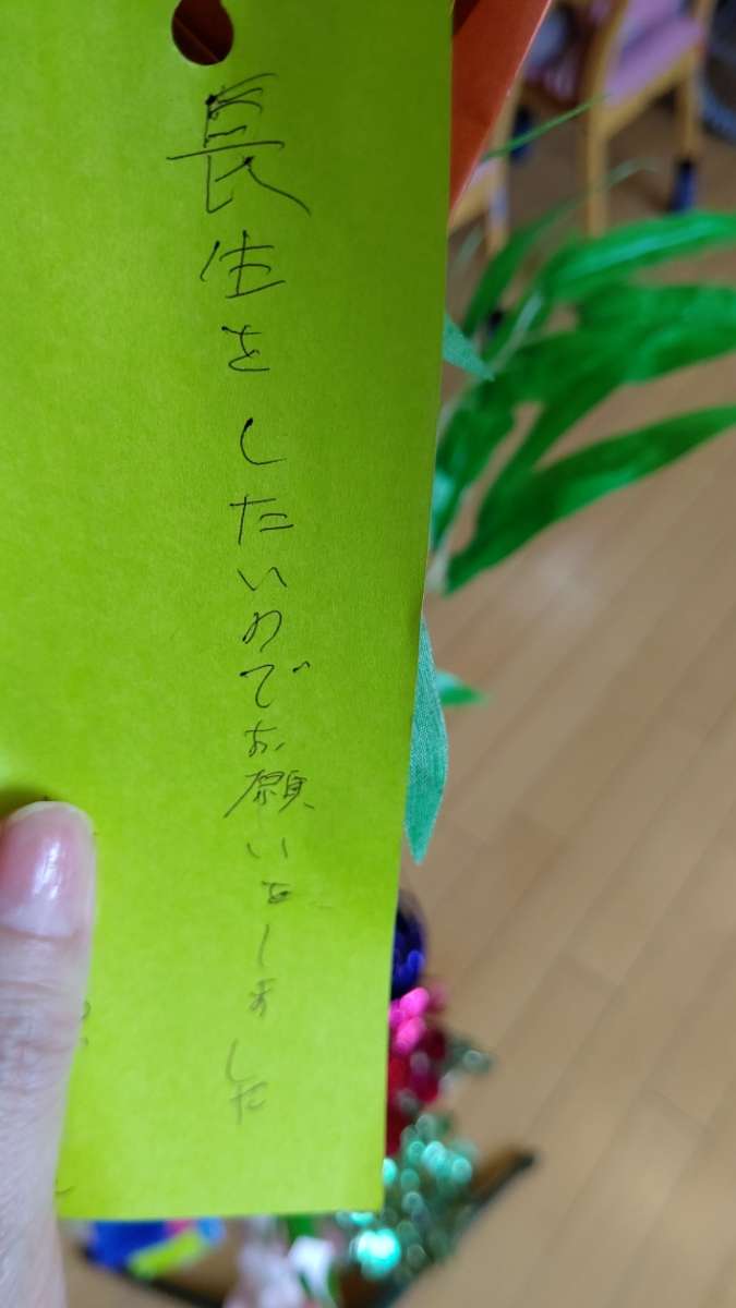 皆様こんにちは( ・∀・) グループホームみんなの家・横浜宮沢2です♪ 雨が続いていますがもうすぐ七夕ですね。 今年も七夕を飾り、皆様の願い事も短冊に書きました。 「元気で長生きしたい」 「子供や孫が幸せに過ごせますように」 「コロナ消えて」←スタッフの願いです(^_^;) 短歌を書いている方もいらっしゃいます。 皆様の願い事が叶いますように(^∇^) そしてコロナが早く終息して元通りの生活に戻れますように。