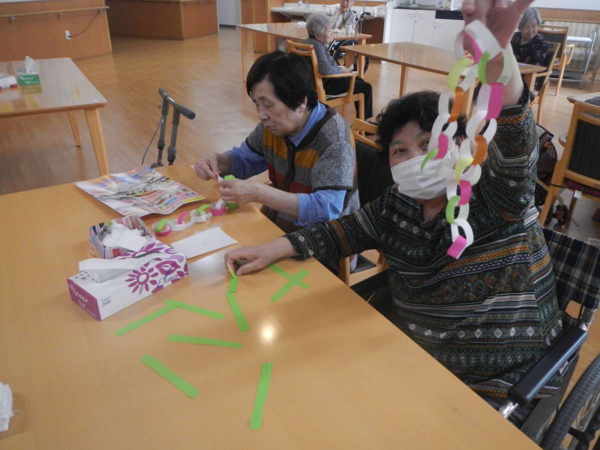 折り紙を細く切り、丸めて輪っかにして繋ぎ飾りを作り、短冊に想い想いの願い事を書きました。
