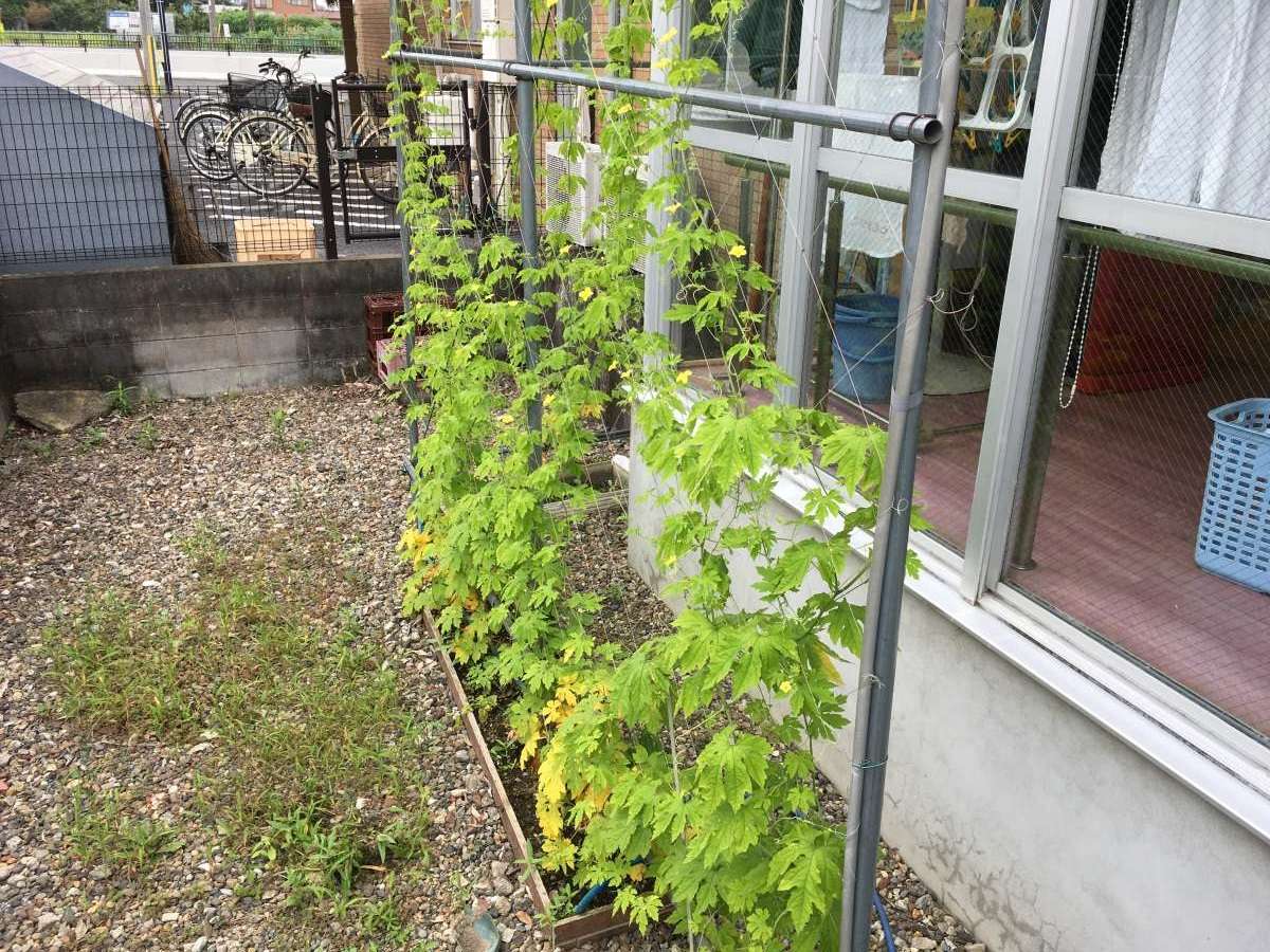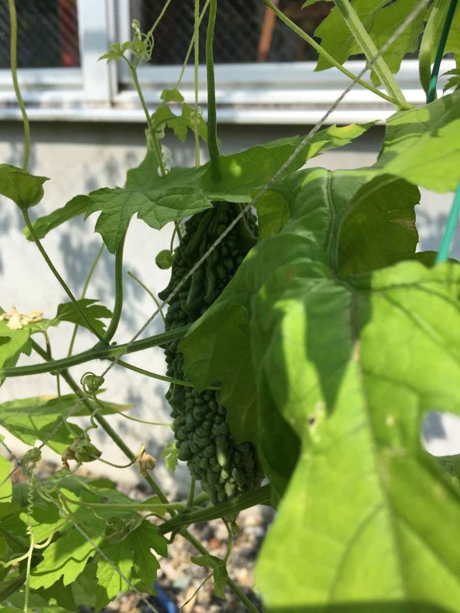 皆さんで植えた 「ゴーヤ」が身をつけました。