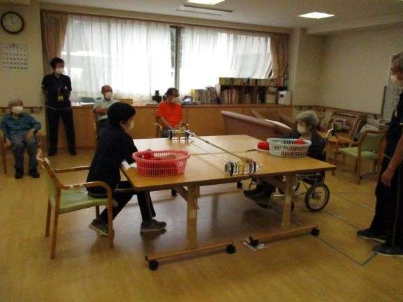 大きなおしゃく状の紐が付ている台に赤いお手玉を時間内