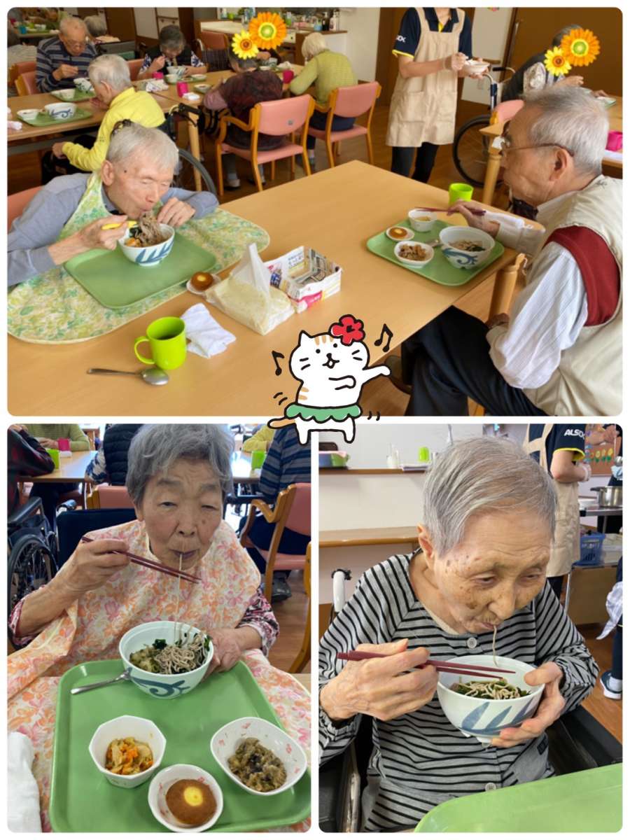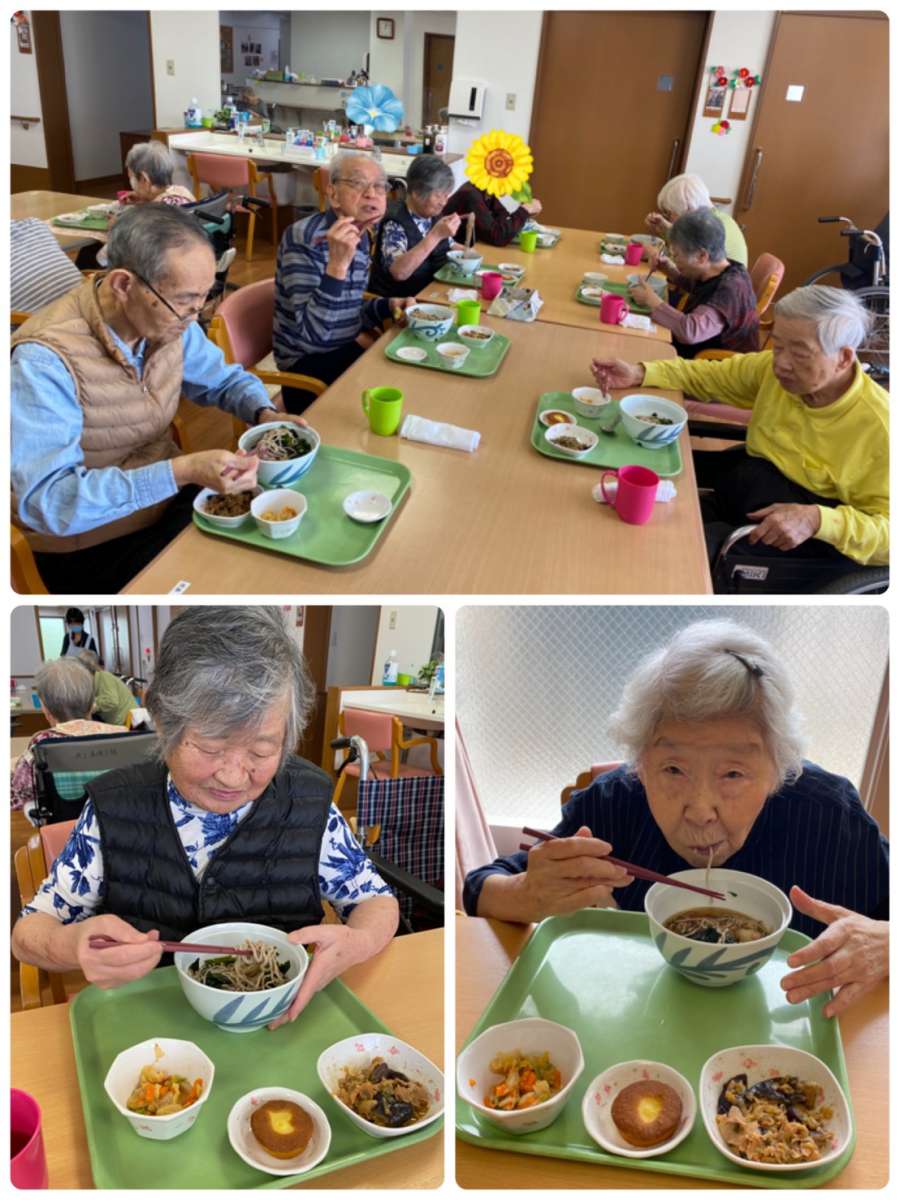 こんにちは。みんなの家・大宮内野本郷です(^。^) 花の丘公園そば。さいたま市西区。 宮原駅西口よりバス6分&徒歩4分のところにある施設です。 ここ数日少し涼しくなったかな♡と思ったら、、、今日は台風の影響で暑かったですね。 体調管理が大変ですが、ストレスを溜めずしっかり食事と睡眠をとって乗り切りましょう(^。^) さて二階の入居者様方は、今日も30分間しっかりと「集団体操・口腔体操・早口言葉」に参加され、意欲的にお身体を動かされていましたよ☆ そしてお待ちかねlunchは、お蕎麦♡ 『暑いから、おろし蕎麦最高だね!嬉しい♬」と、大好評でした♪( ´θ`)ノ