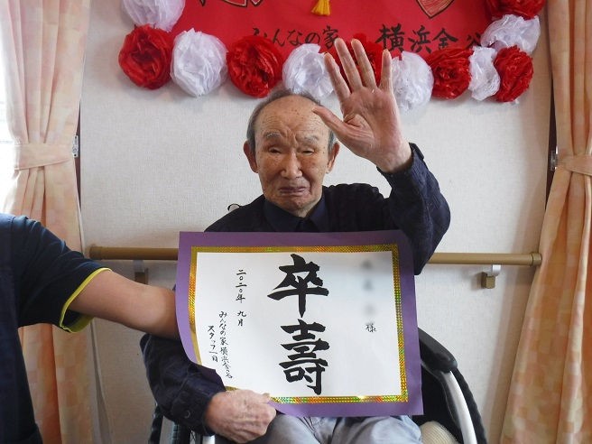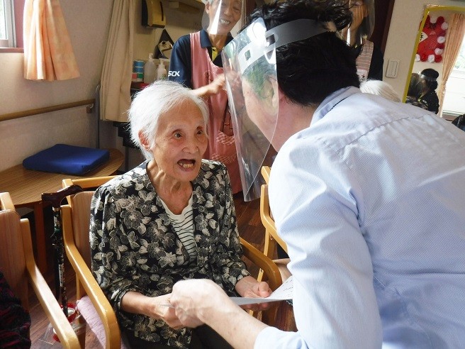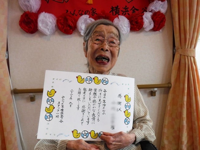 お元気に敬老の日を迎えられたことをお祝いしてスタッフから表彰状を・・・