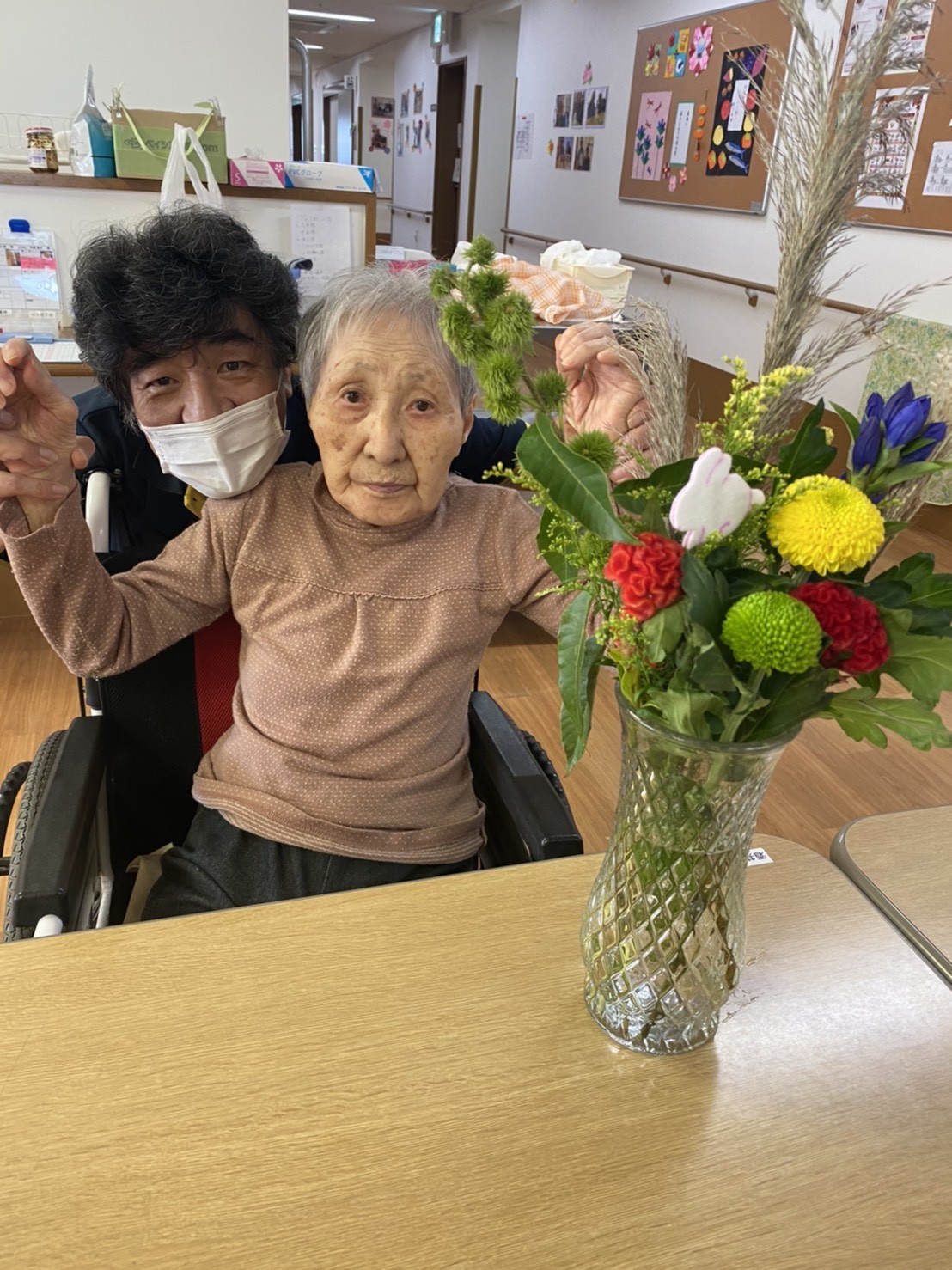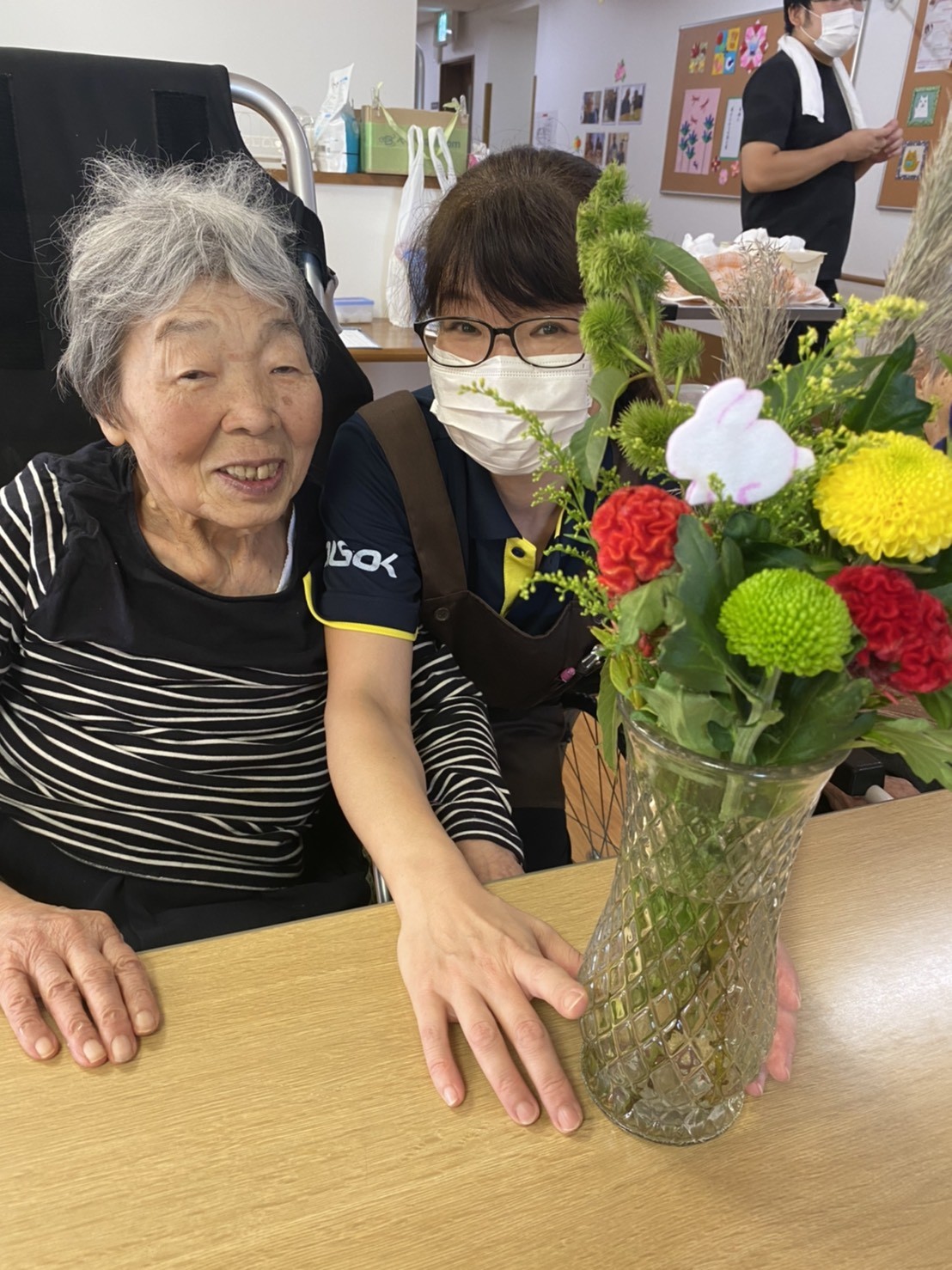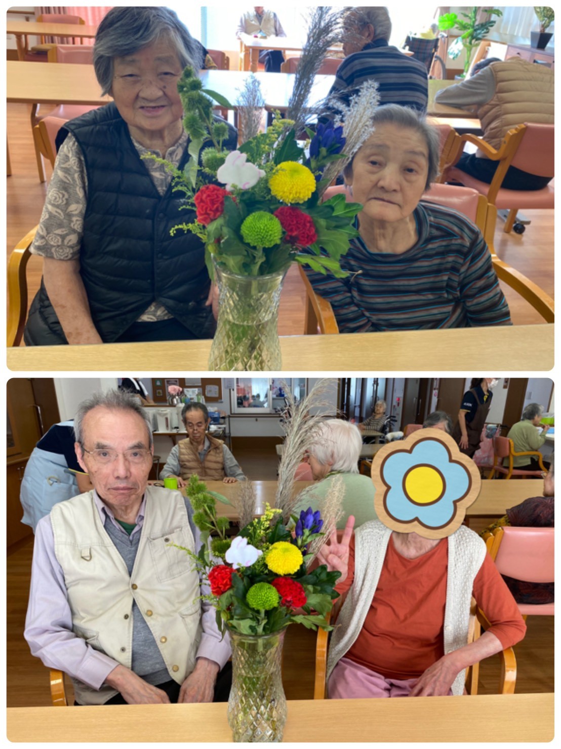 秋がやってきて♡どんどん空が高くなり雲が綺麗に見えたり空気が澄んでいきますね。 先日の『中秋の名月☆』、皆様は『お月見』されましたか(^。^) 我が家のバルコニーからも、まんまるなお月様☆を見ることが出来ました♬本当に綺麗でした♡ お月見団子を作ったりススキを飾ったり、お月見ならではの『日本の楽しみ方』がありますね☆ 本日の二階の入居者様方のご様子です(๑˃̵ᴗ˂̵) 『やっぱり生のお花やスズキはいいねぇ♬』と、沢山の笑顔が見られました♡