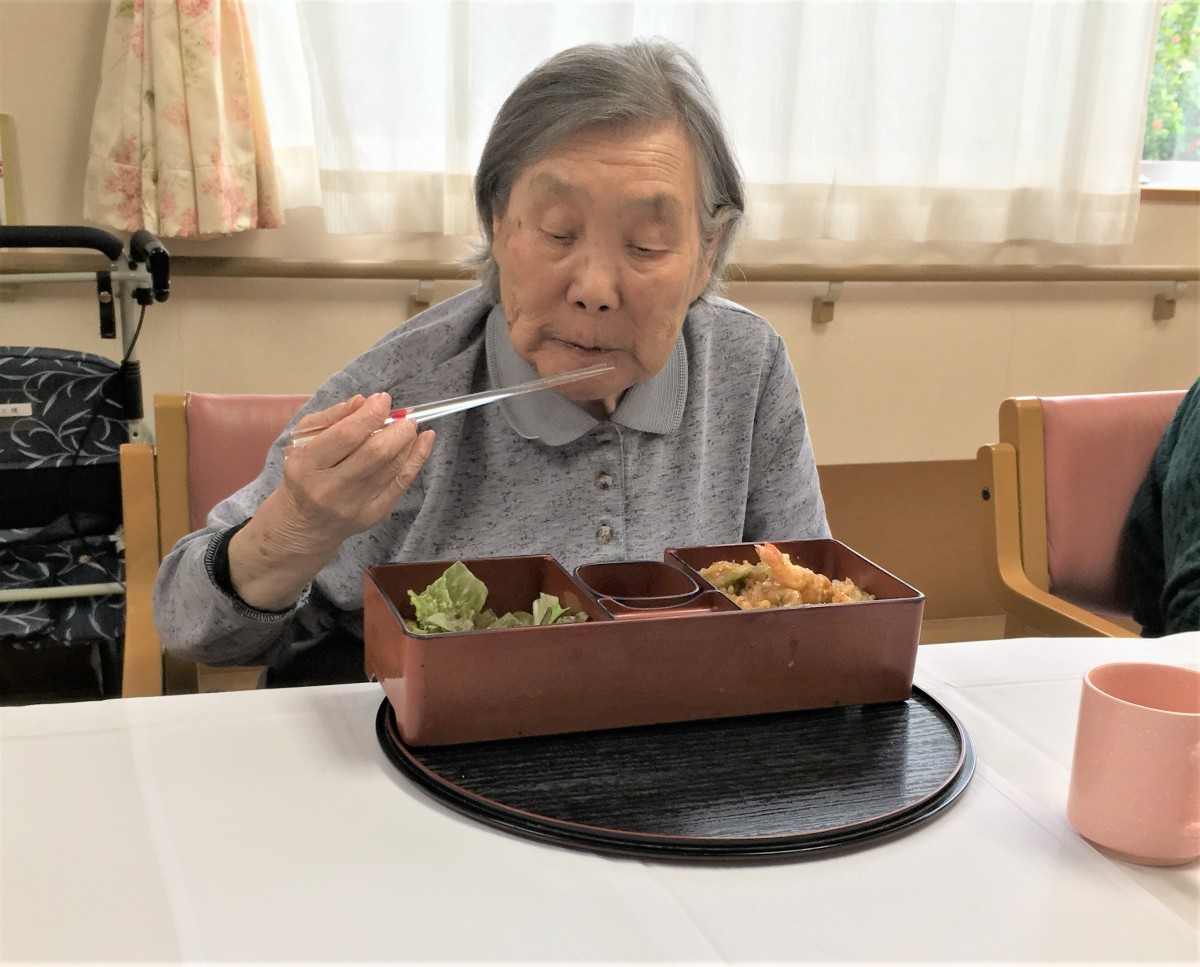 お昼ごはんが始まる前に、ケアスタッフ手作りの色紙をお渡しして記念撮影をいたしました。