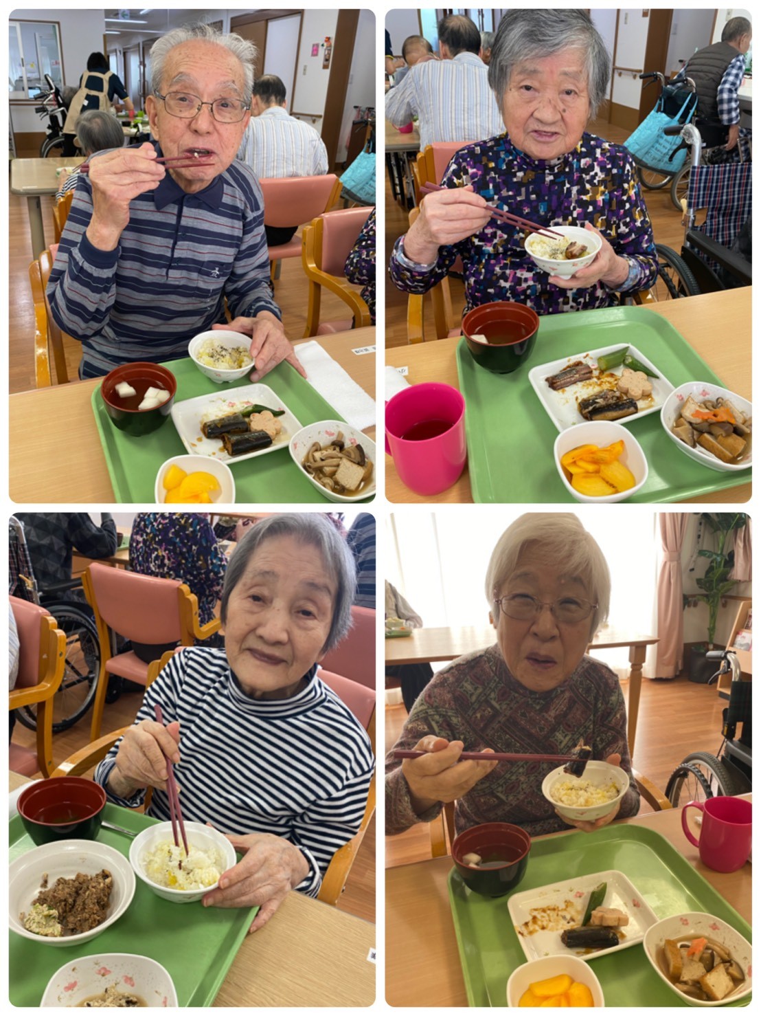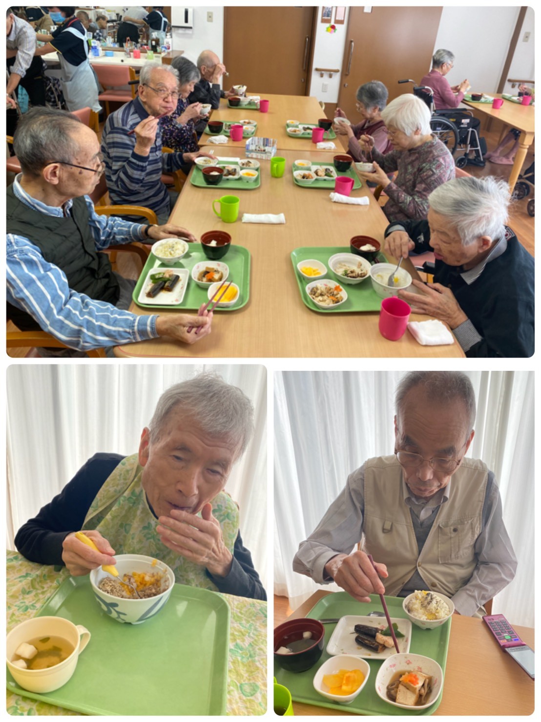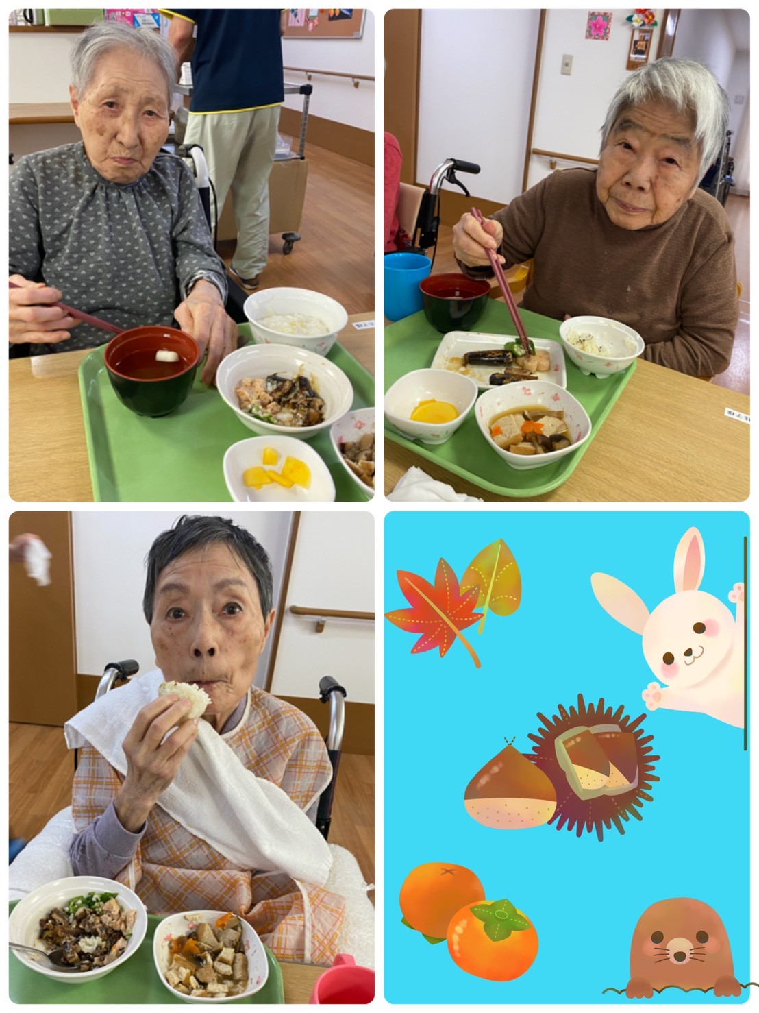 今日のお昼は特別メニュー☆でしたよ(๑˃̵ᴗ˂̵) 『集団体操・早口言葉・口腔体操』をしっかり行ってから☆ 『サツマイモご飯、懐かしい!』『柿は今年初めて食べるよ』と、皆様賑やかに召し上がっていらっしゃいました(^。^)