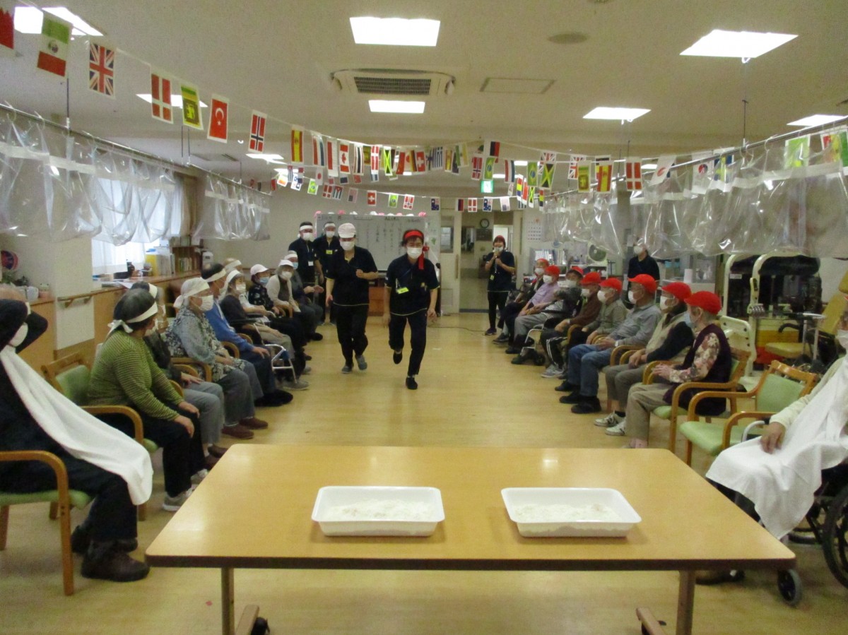 職員2人一組にて『飴食いレース!!』で競争しました。スタートから神経戦を展開し多量の小麦粉の入れ物を取り合いながら