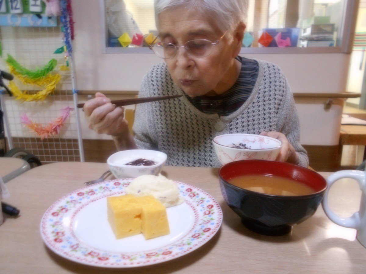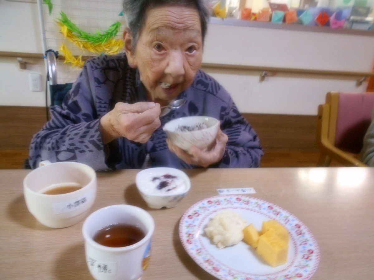 お赤飯、なめこみそ汁卵焼き、ポテトサラダ。デザートはヨーグルトでした。
