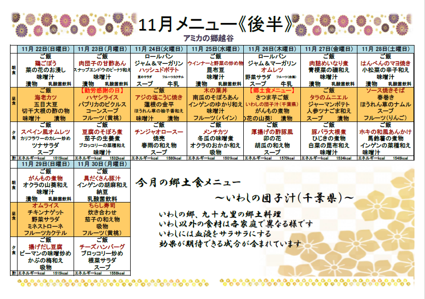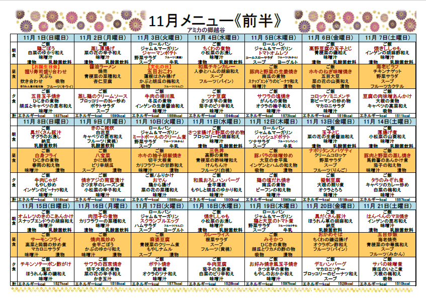 11月のアミカレンダー・献立表