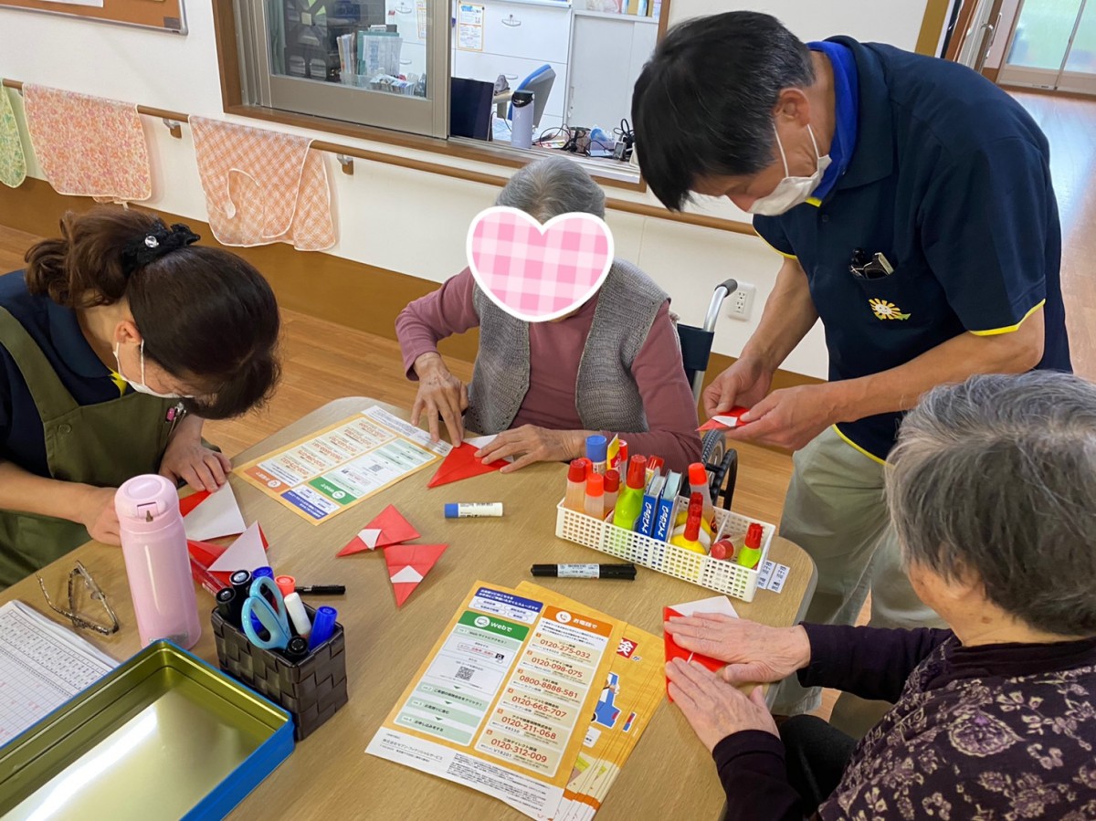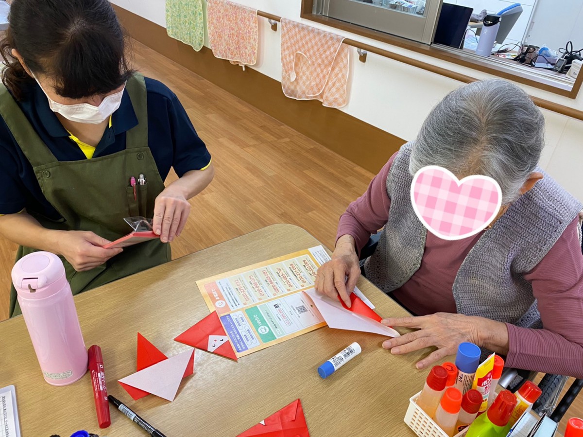 今日の午後は、少し早いですが『サンタクロース』を折り紙で作りました(๑˃̵ᴗ˂̵) スタッフと一緒にYouTubeを観ながら楽しく作成(笑) お顔もマジックで書きましたよ♡ 『今はこんな便利な物があるのね!』『本より分かりやすいわ♪』『可愛い!次は違うものも折ってみたいわね♡』など盛り上がりました(^。^) ◉手指を沢山使いリハビリとなる ◉注意力の向上 ◉達成感の享受 ◉昔のことを思い出し、周囲の方々と話しながら作ることで『回想法』に繋がる など、折り紙は良いことずくめなんですね☆ また是非やりましょうね♪