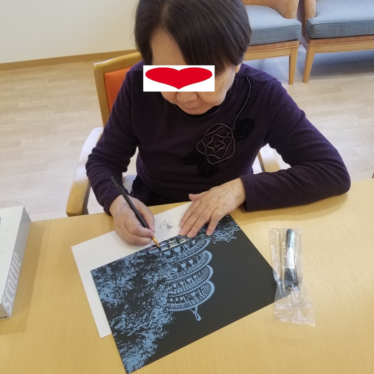 こんにちは。今回も女性入居者様が新たなスクラッチアート作品に取り組まれてます