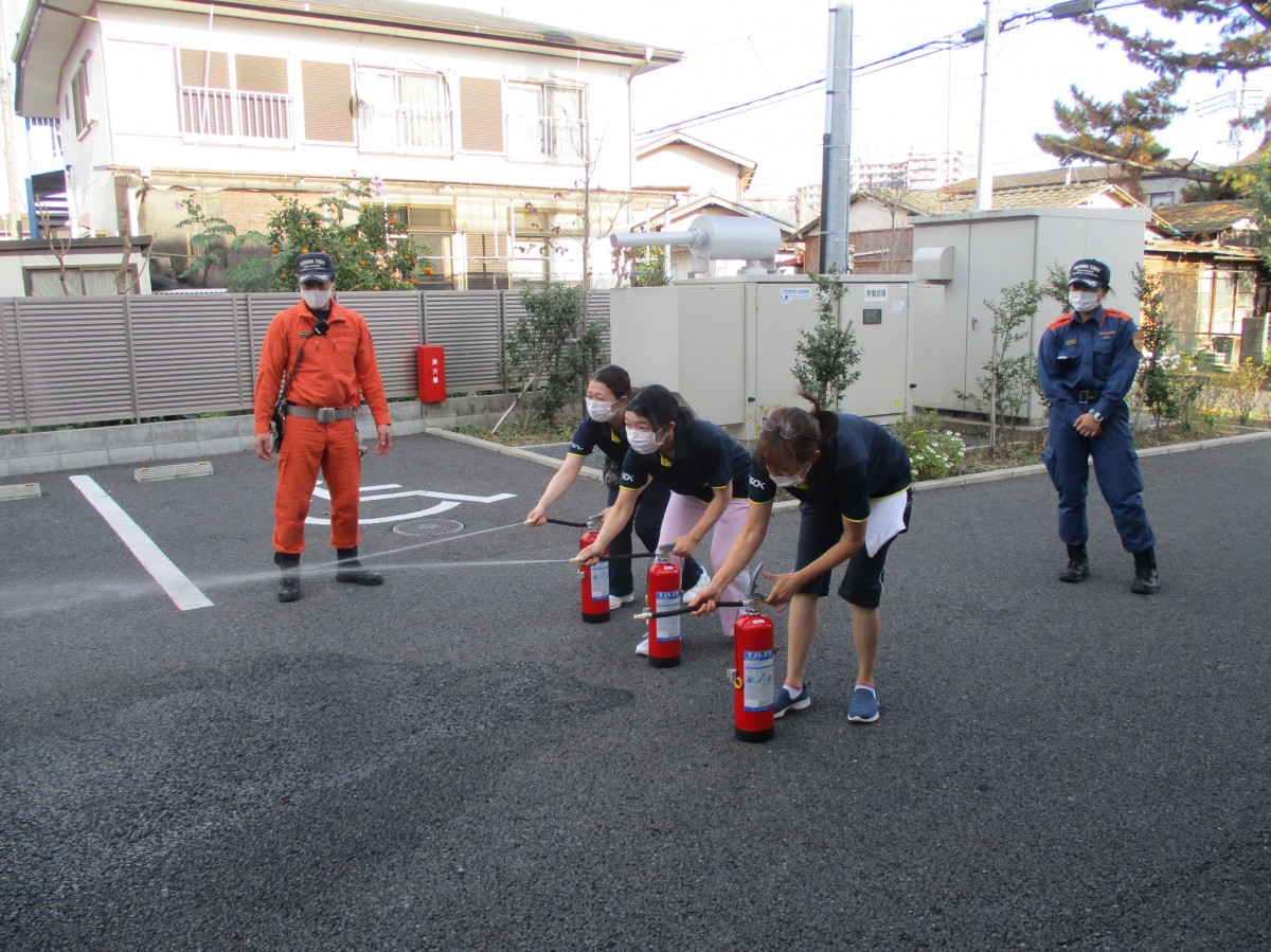 玄関前に避難後、消防署の方から消火器の使い方や避難時の注意点などを説明して頂きました。