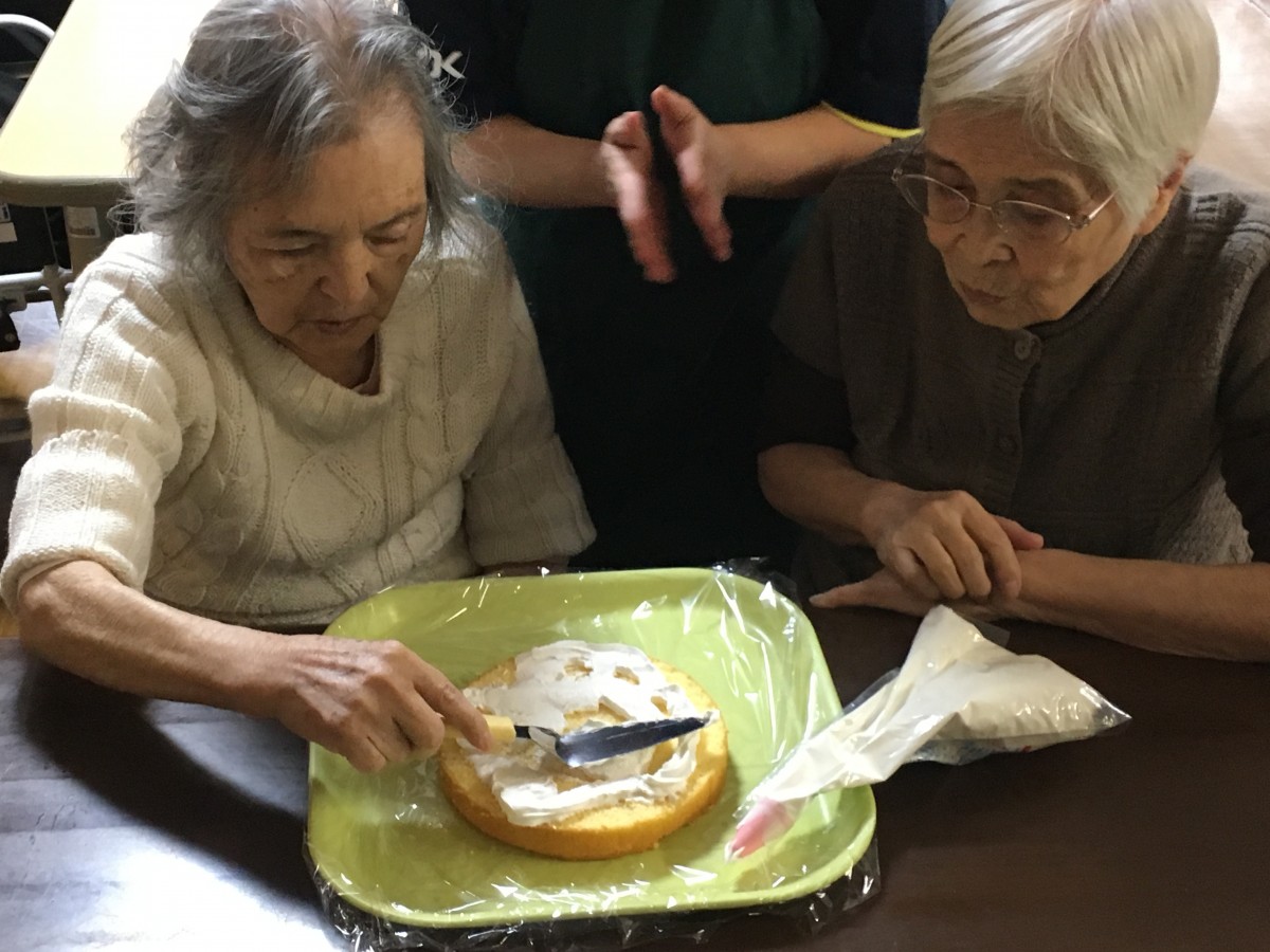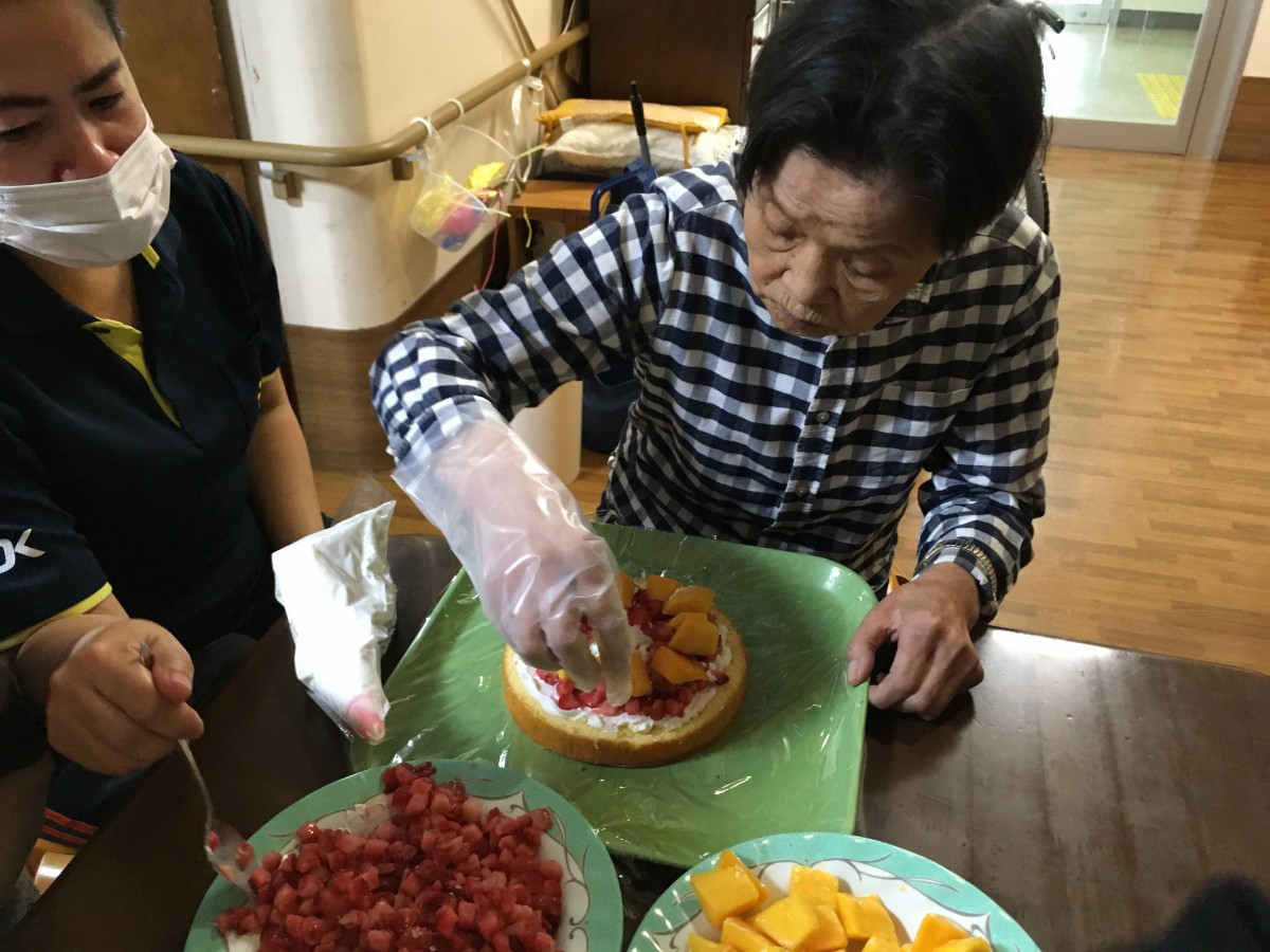 各階、代表のご利用者様に参加していただき、スポンジケーキとホイップクリームとフローズンフルーツとを使ってデコレーションケーキを作っていただきました。
