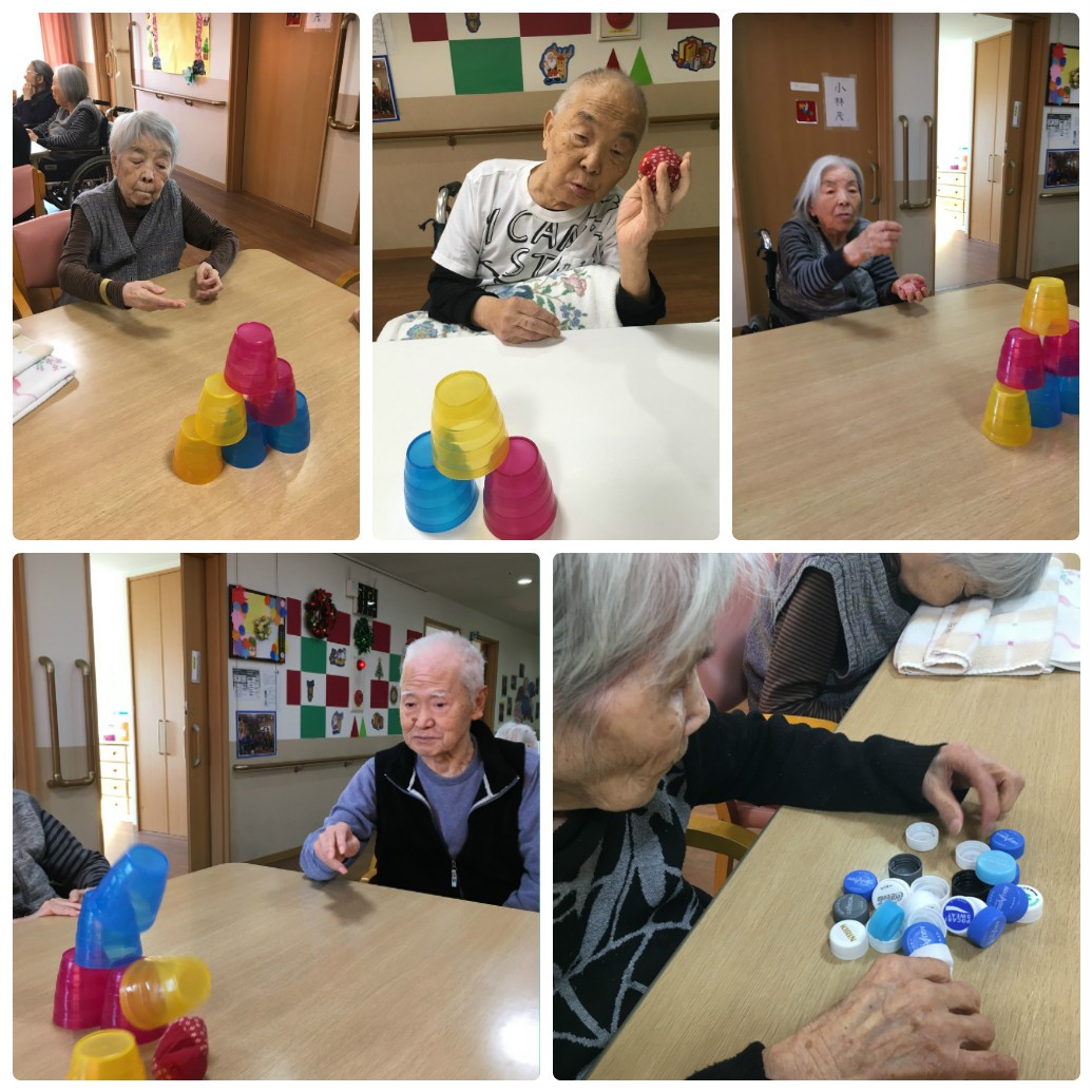 お手玉を使った的あてやペットボトルの蓋を使った積み木。
