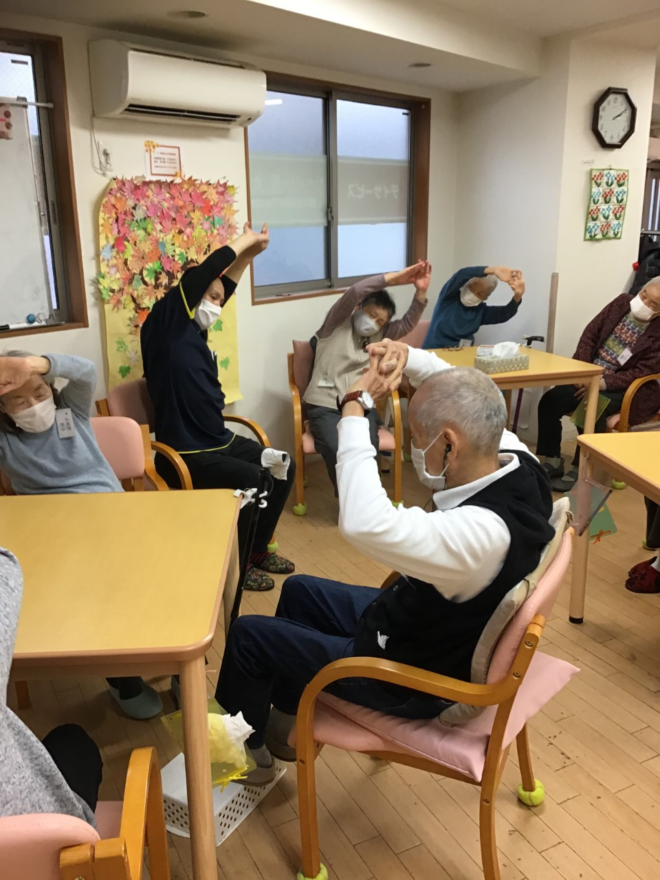 機能訓練士さんのやさしい声掛けに、皆さん のびのび。