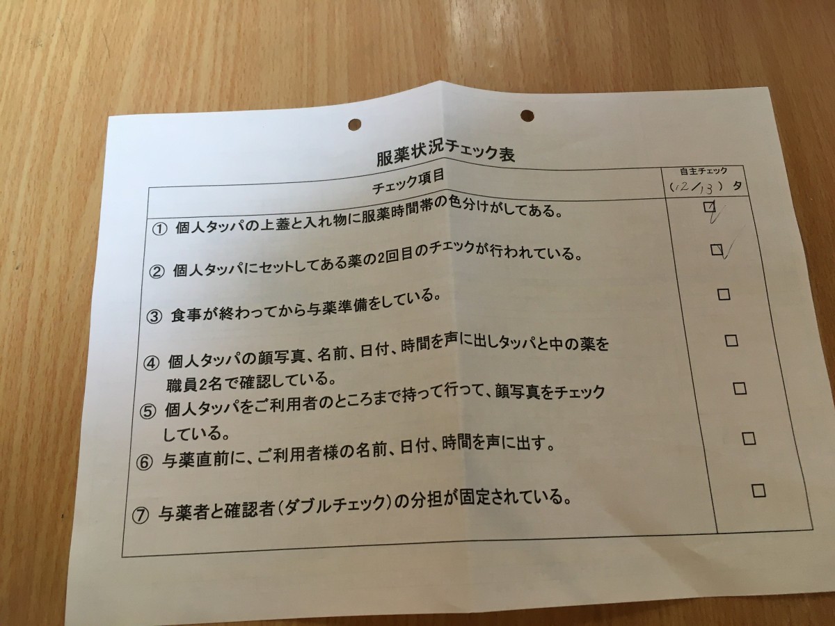 次に、入居者様にお名前を読み上げていただき(ケースに名前が書いてあります)、一袋ずつ、日付、飲む時間を一緒に確認します。