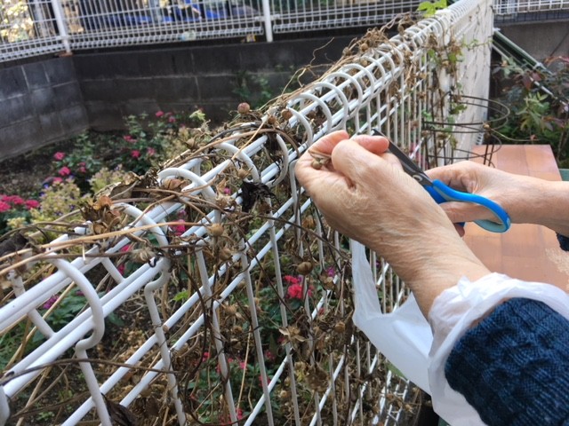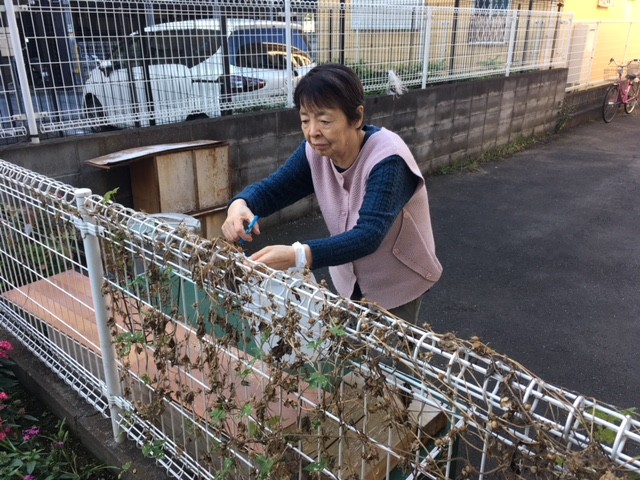 写真の通りあさがおの種がたくさんついていました!はじめは素手で種だけを採ろうとしていたのですが、種が落ちたりしてなかなか上手く出来なかったためはさみとバケツを用意してお2人の入居者様に手伝って頂きながらきれいに収穫しましたよ。柵にぐるぐると巻き付いていたため根気のいる作業でしたが集中してあっという間にほぼ全部の種を採る事が出来ました。