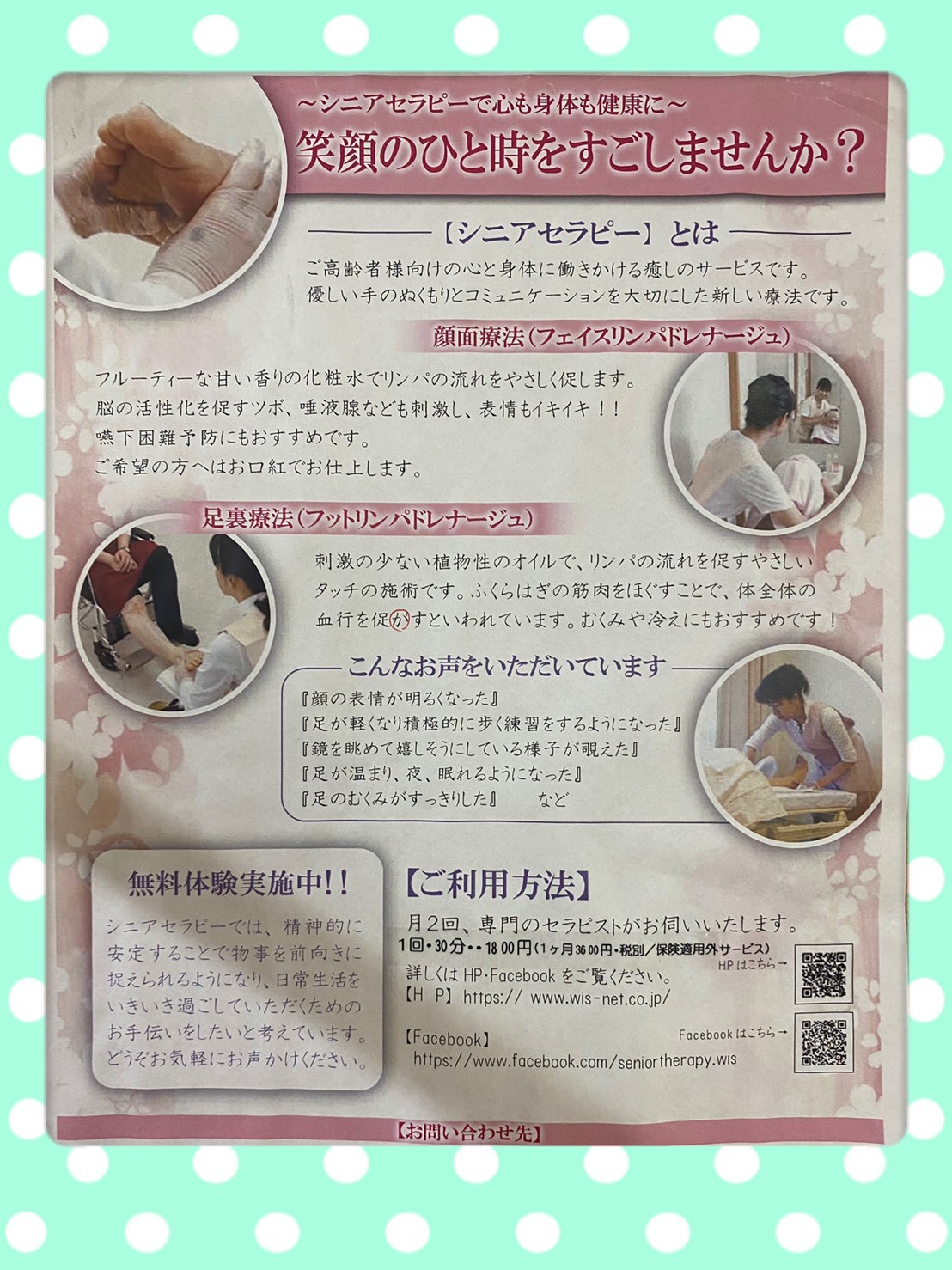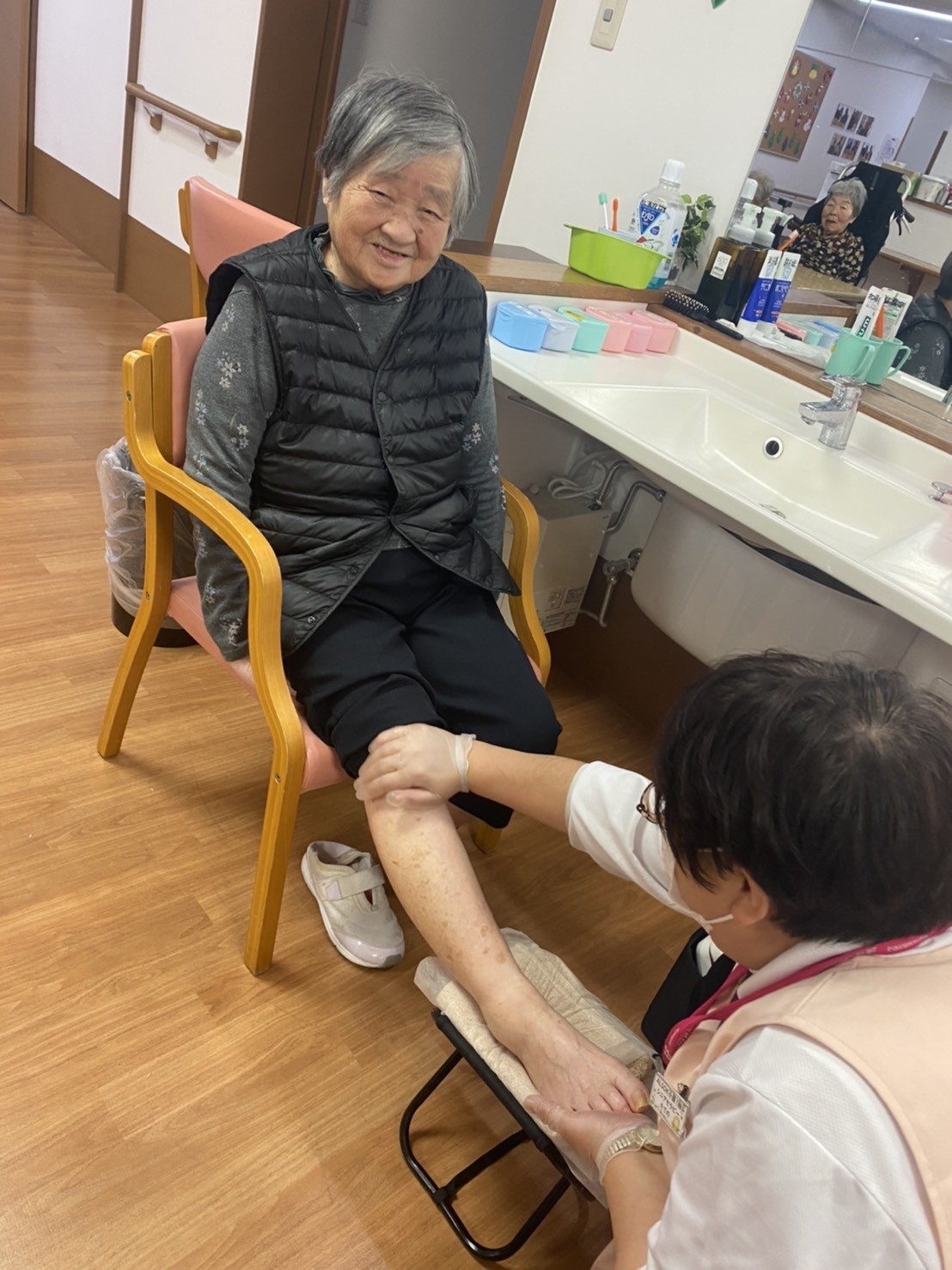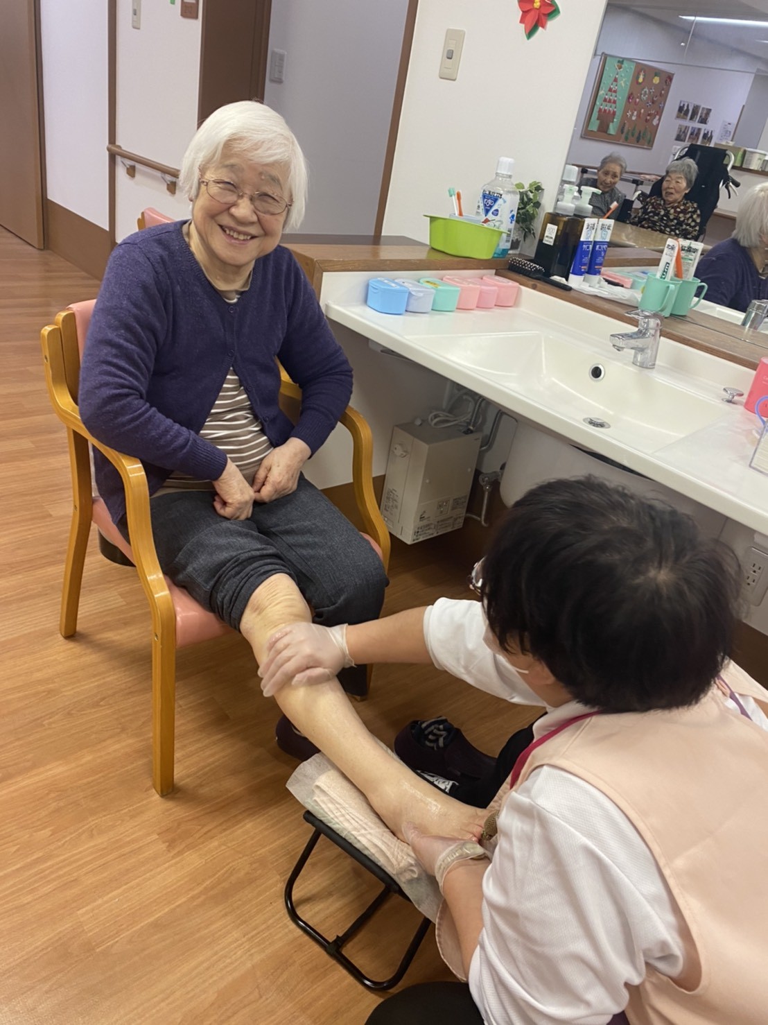 今日は入居者様お待ちかねの『シニアセラピー』の日でした♡ 足裏療法・顔面療法の施術で、足の浮腫や冷えの改善、嚥下機能の改善・向上が期待出来ます。 セラピストによる、優しい手のぬくもり♡対面によるそれぞれの方に合ったコミュニケーションを図れるメリットもあります。皆様、大変気持ち良さそうでしたよ〜♬