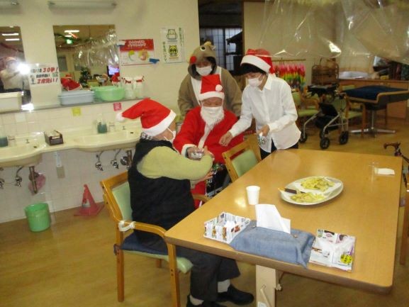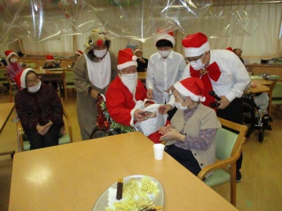 最後にサンタさんとトナカイさんが各テーブルに訪れクリスマスプレゼントをお渡ししました。