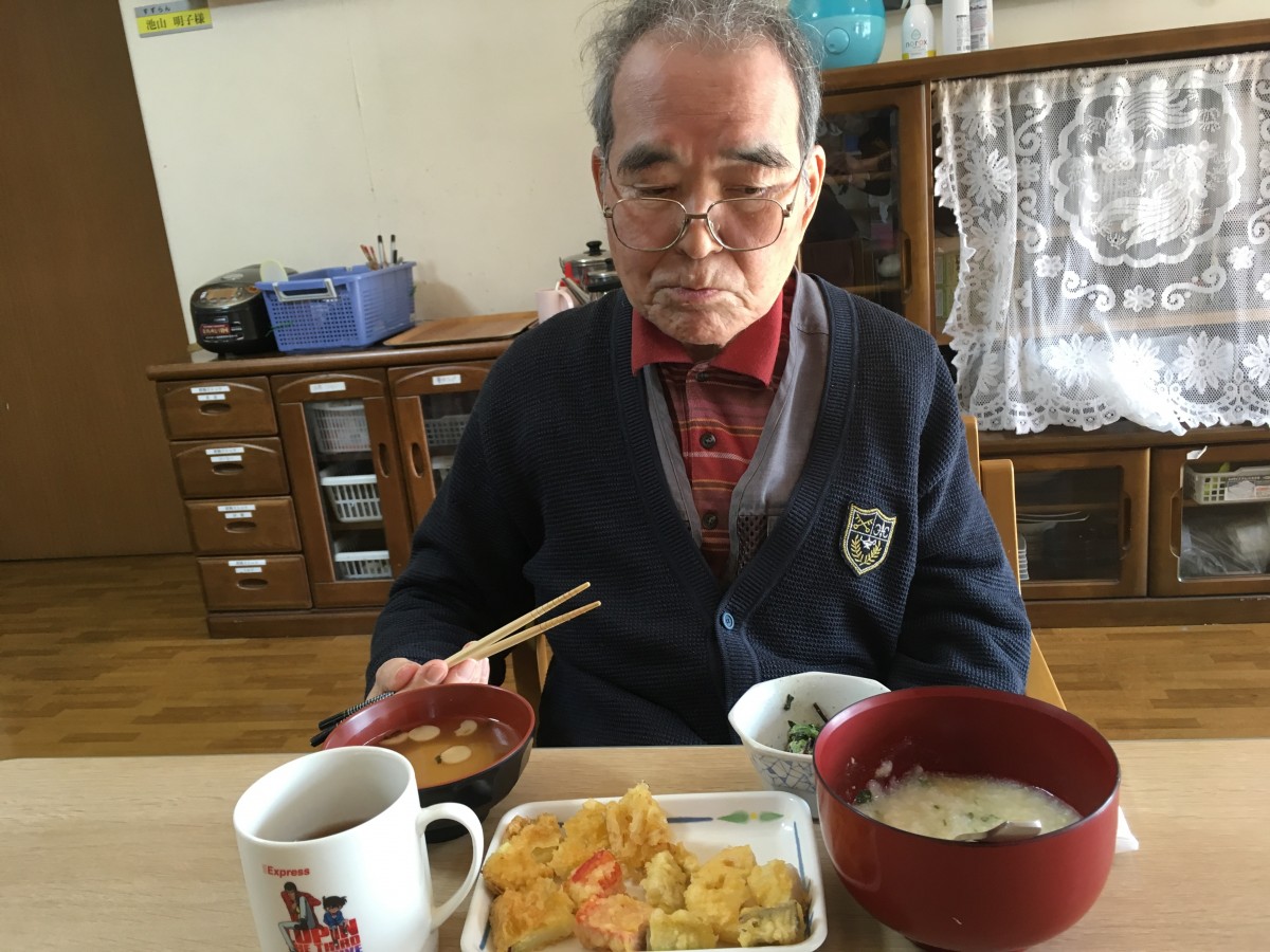 おかずは各階で準備し、1階では「天ぷら各種とひじきとほうれん草のサラダ、味噌汁」を添えました。
