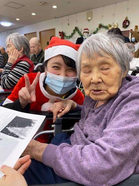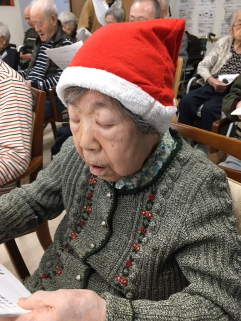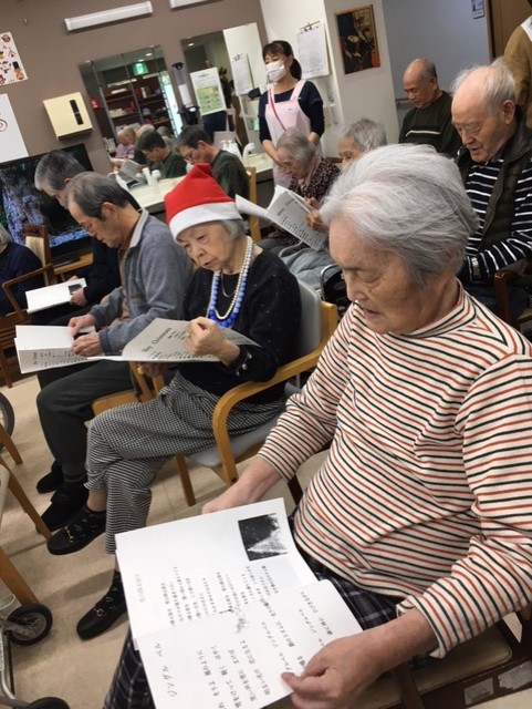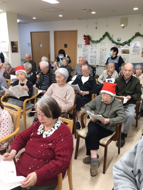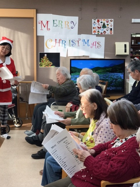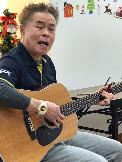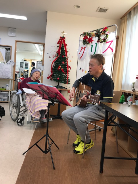 芸達者な職員のギターに合わせて、クリスマスソングや昭和懐メロの大合唱!!