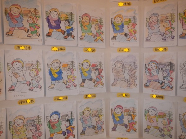 最近の寒さを象徴した「スケート」の塗り絵や「雪だるま」の貼り絵。