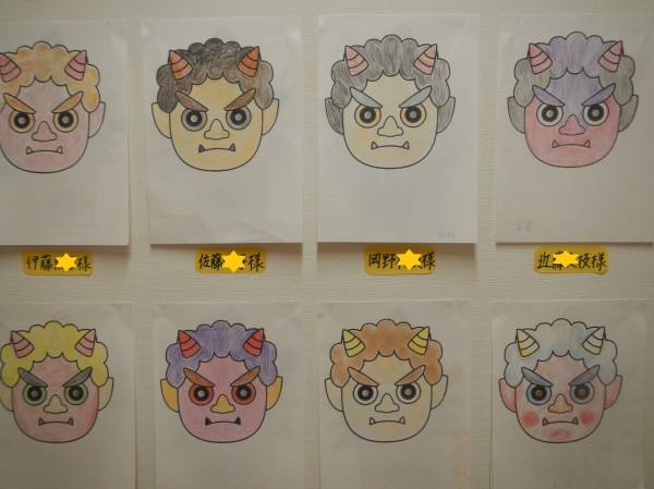 塗り絵は、個性溢れる配色で、いろいろな「鬼」や「スケート」が塗りあがりました。