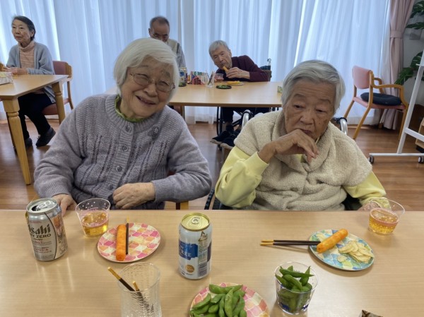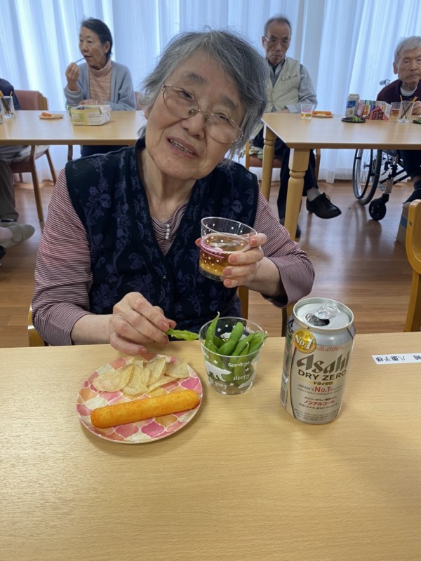 男性入居者様方には特に喜ばれています♡♡♡ コロナ禍の為、一階と二階と別々に開催しました。 ノンアルコールビールやサワーで
