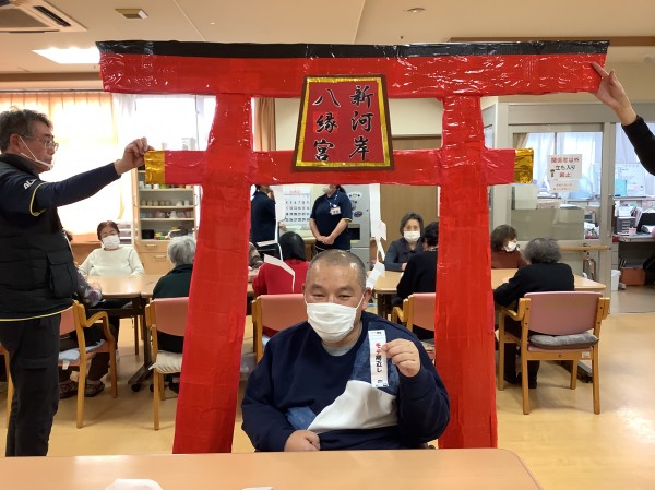 1月4・5日に初詣を行ないました! まずは鳥居をくぐり、お賽銭をします お金はデイサービスの手作りお札を使っています( ・∇・