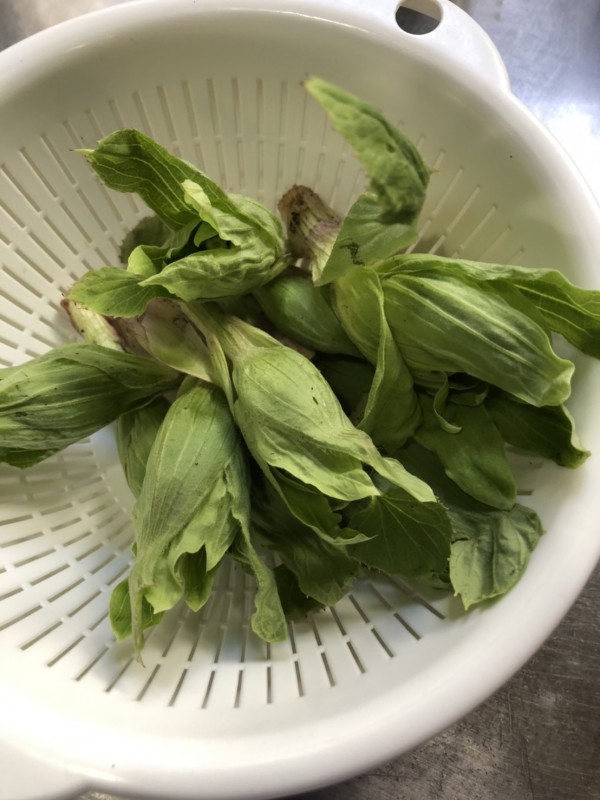 半分ほどに切ってから茹でて灰汁を抜き、細かく刻んで炒め、