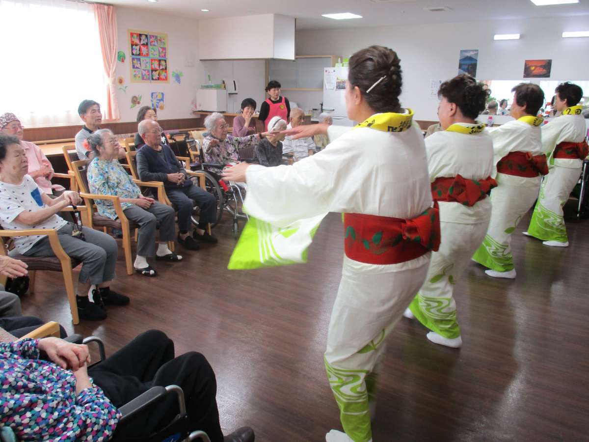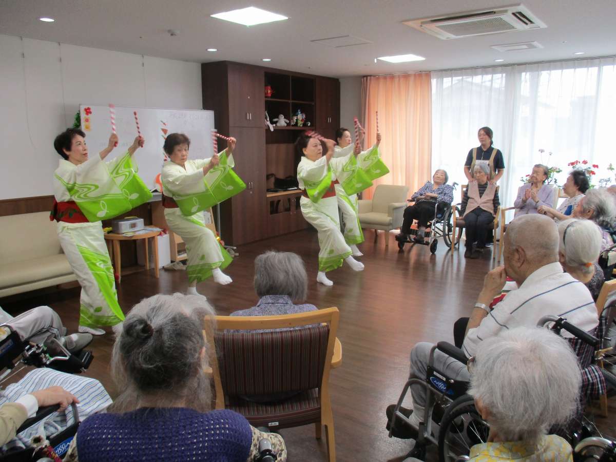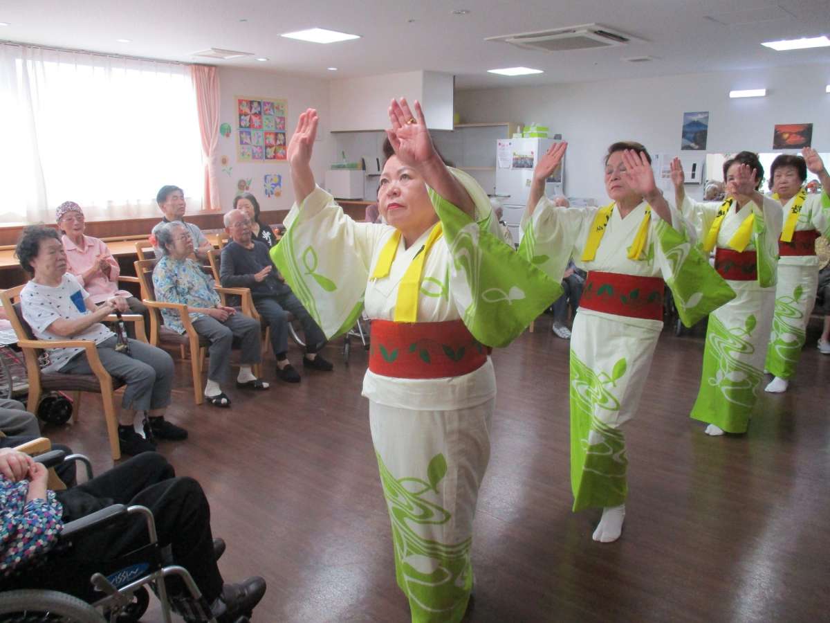 介護付有料老人ホームみんなの家与野公園の夏まつりにもご参加いただきたカトレア会のみなさんの再登場です!ご利用者様みなさんがよくご存じの曲で踊りを披露していただきました。秋になったとは言え、まだまだ暖かい日が続く今日この頃ですが、会場の熱気も最高室温更新!とばかりに高まっていました。カトレア会のみなさんの華麗な踊りに魅了されながらも、民謡に体がうずくご利用者様は、その輪の中に入り、一緒に踊られていました。今後、定期的に開催する予定です。ぜひ、ご期待ください。