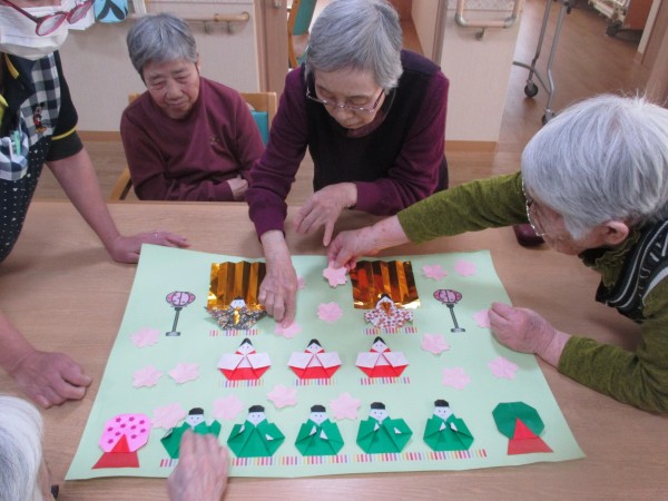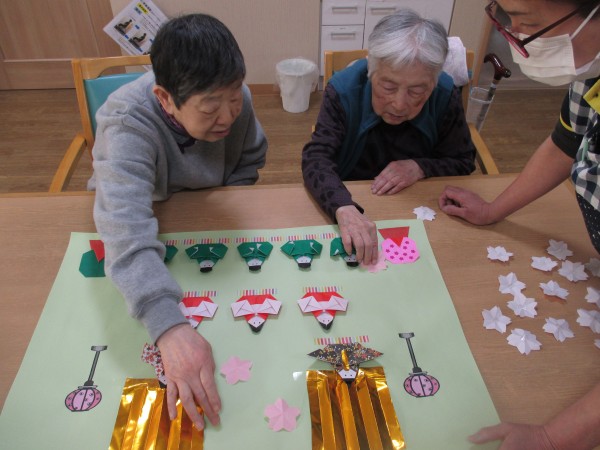 ご入居者様と一緒に雛飾りを作りました。