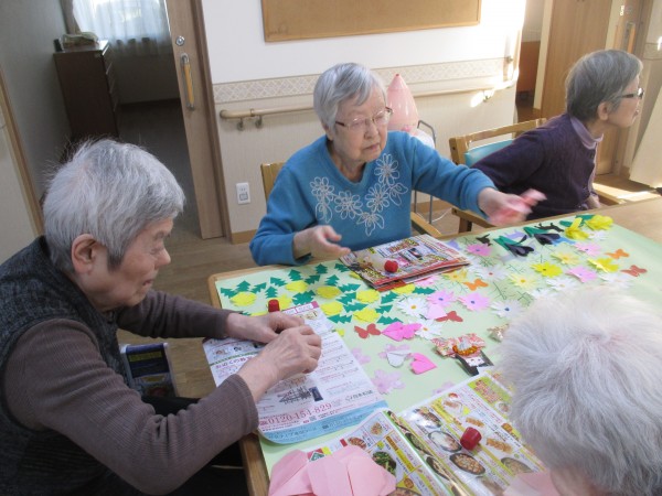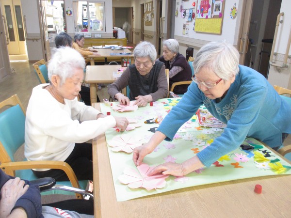 1階のご入居者様と一緒に春のお花を貼っていただきました。