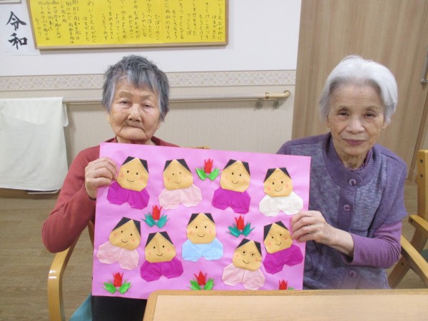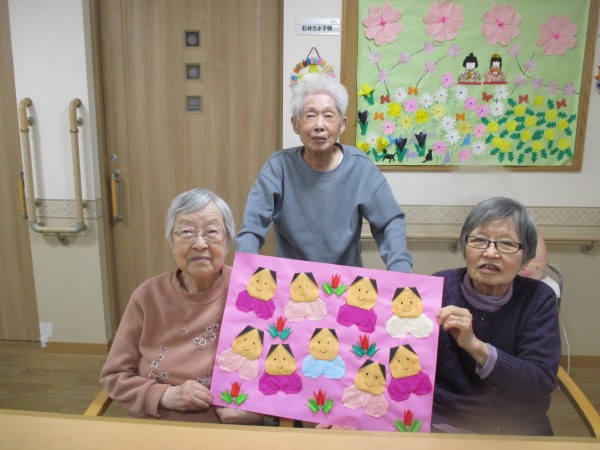 1階のご入居者様で作られた壁飾りと一緒のご様子です。
